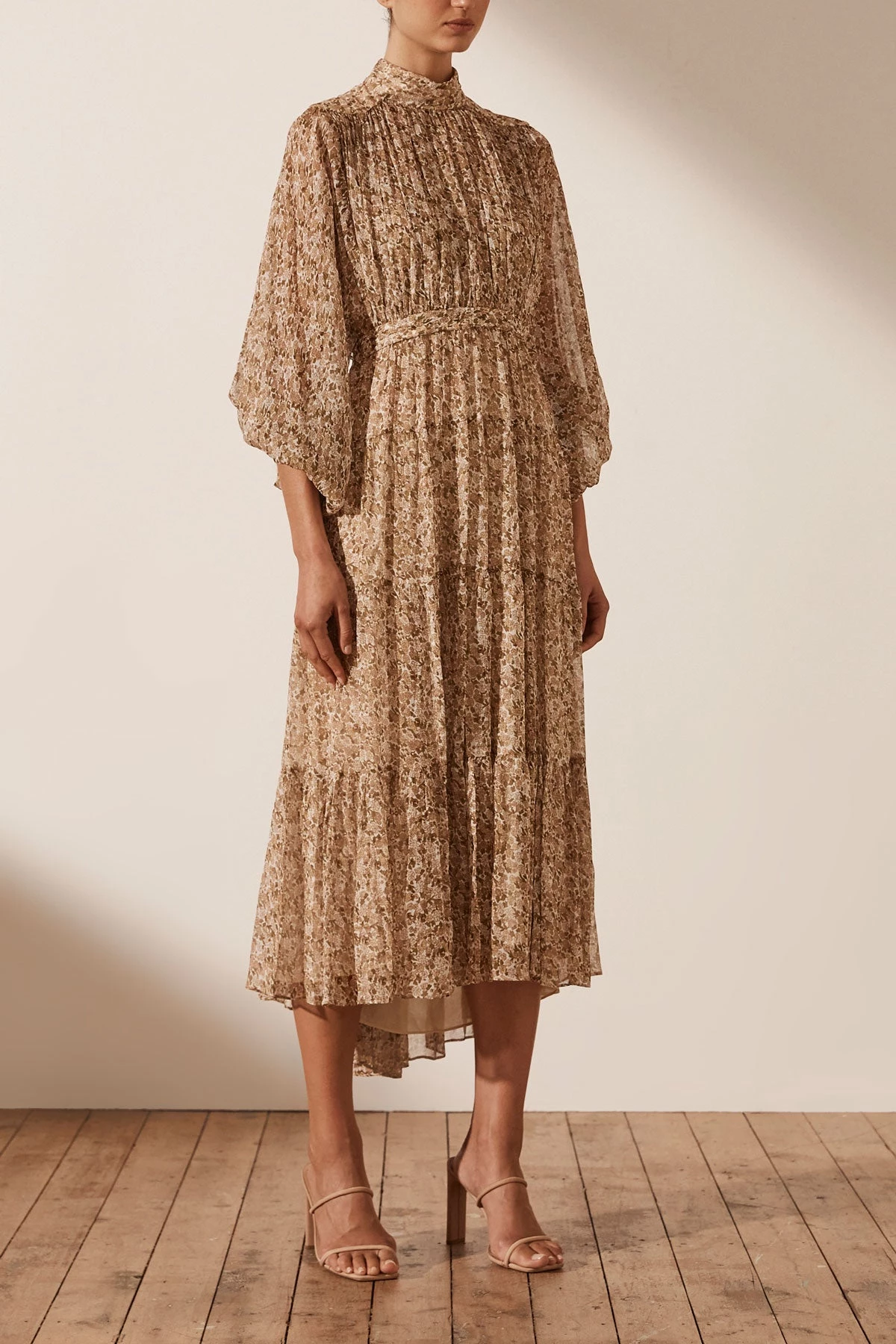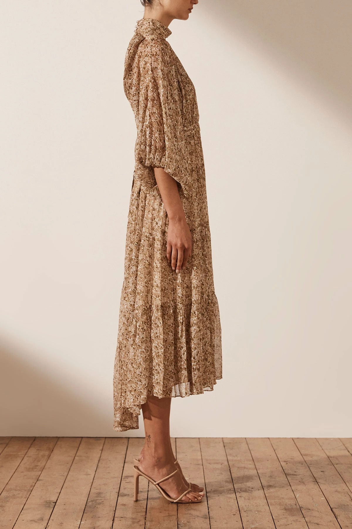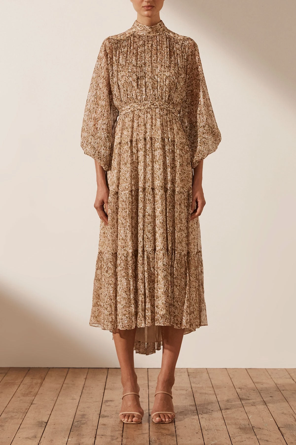 Backless long sleeve midi dress in a light weight semi-sheer chiffon in the exclusive Ambar print.
