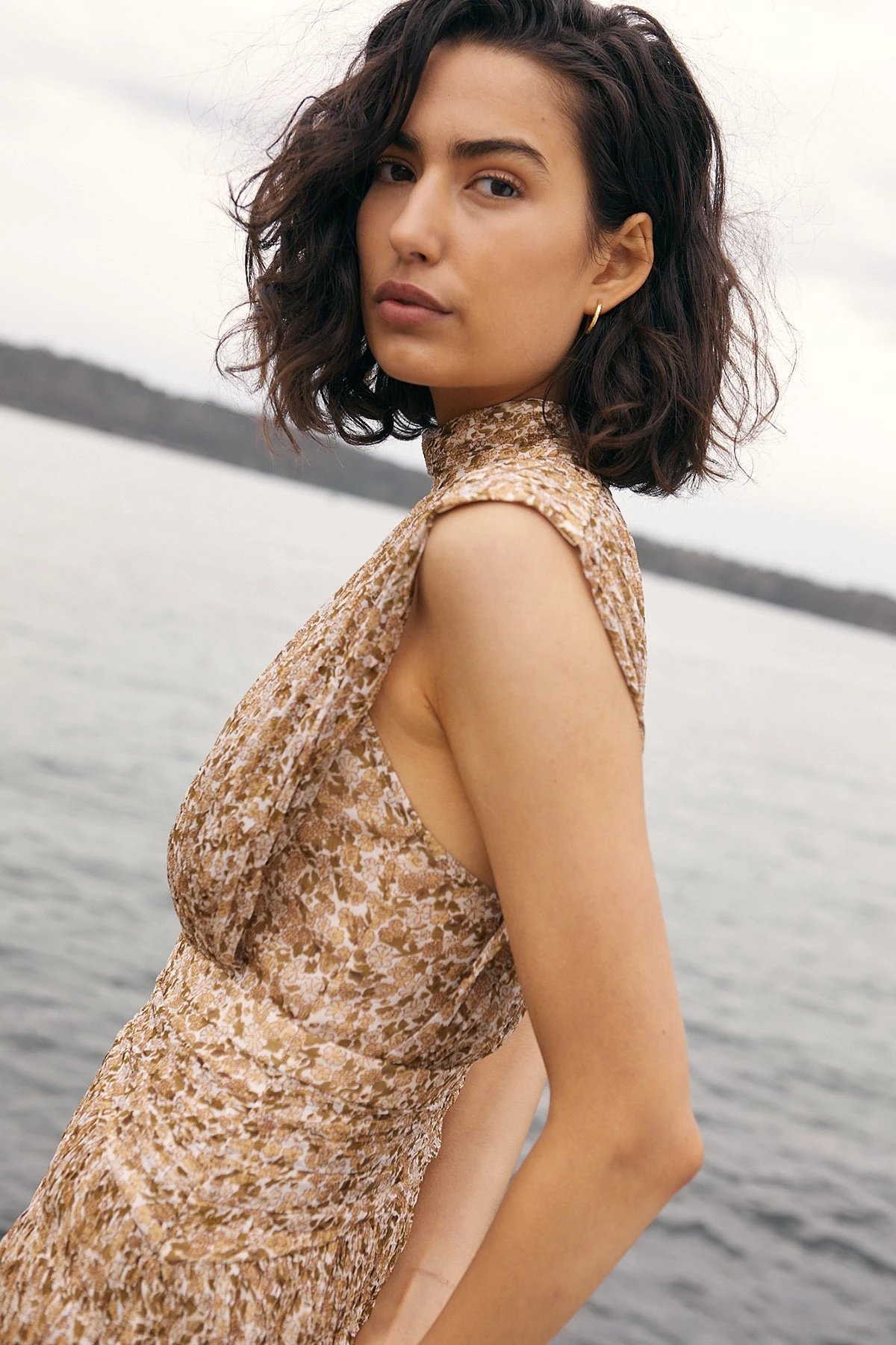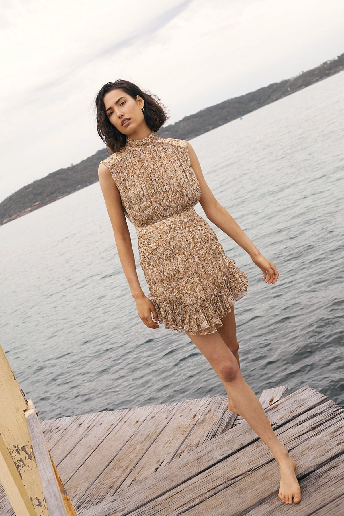 Sleeveless ruched mini dress in a light weight semi-sheer chiffon in the exclusive Ambar print.