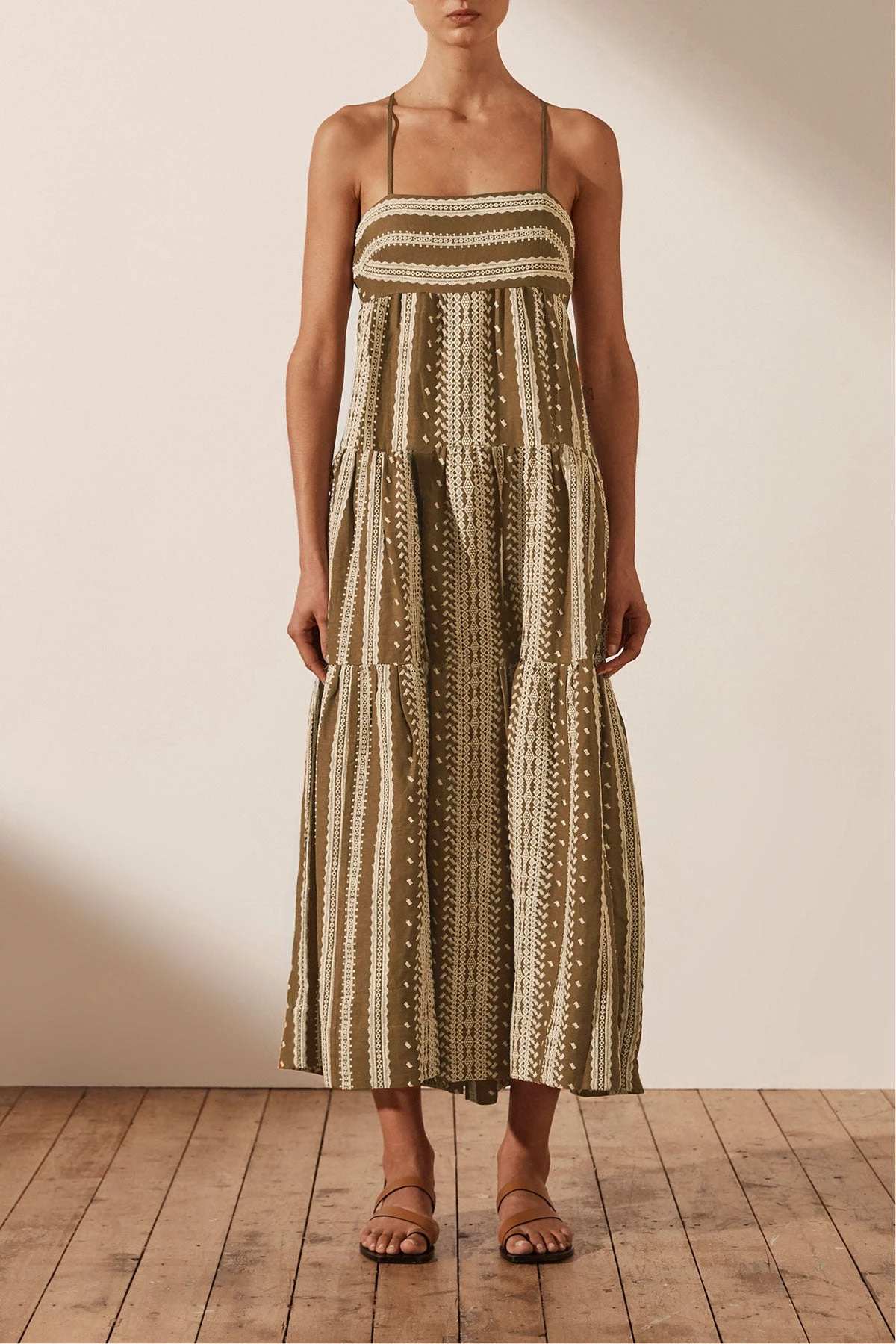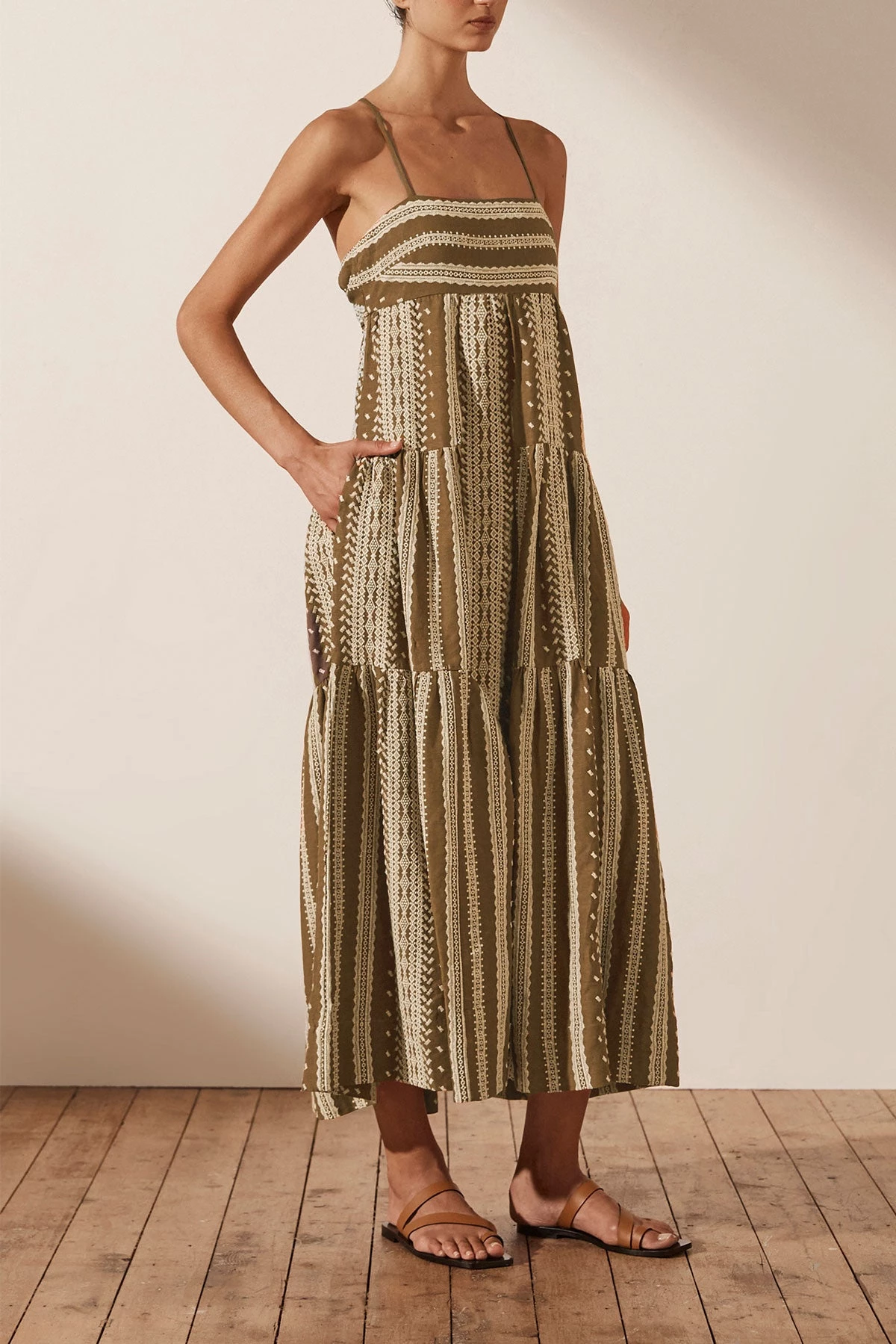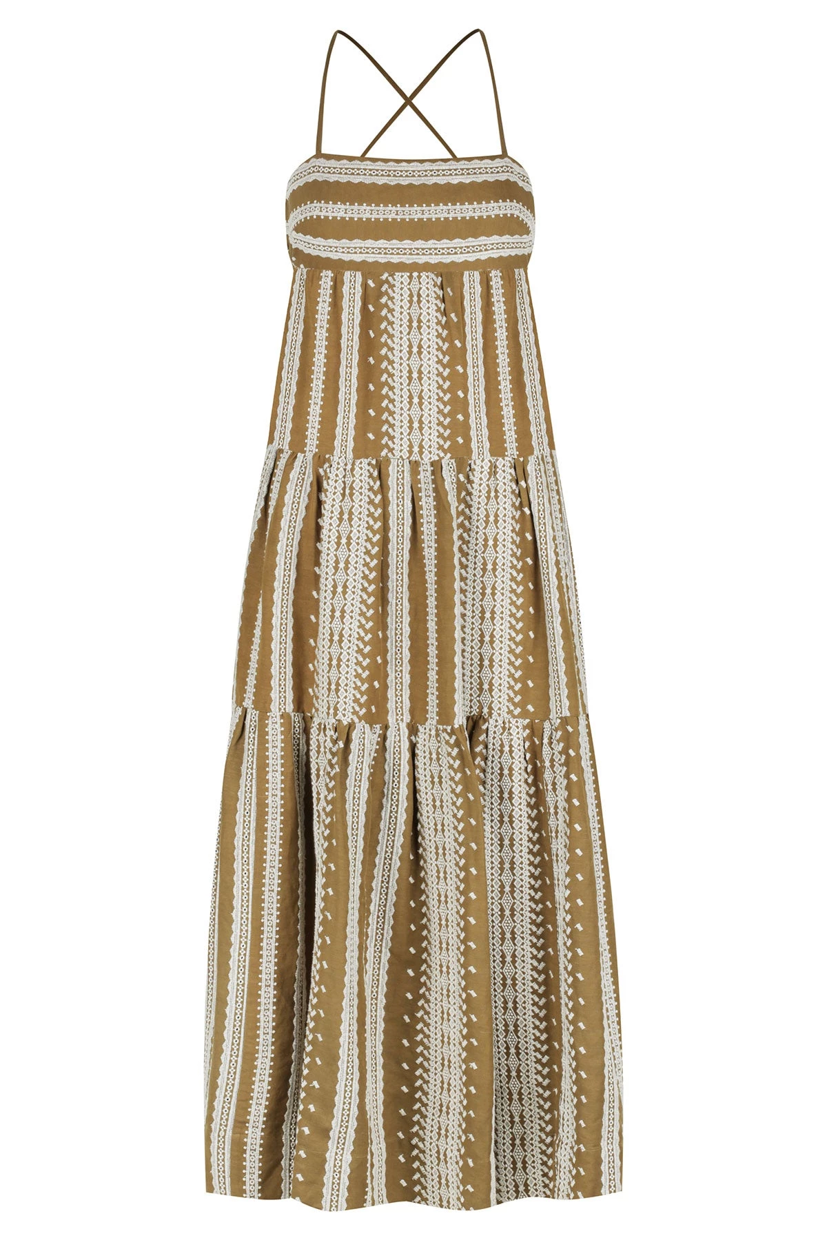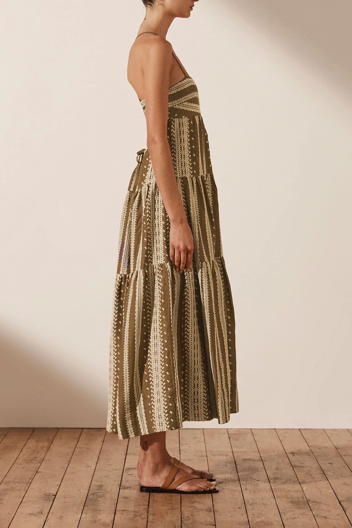 Shona Joy ATLAS LINEN BACKLESS TIERED MIDI DRESS – CUMIN/CREAM DRESSES