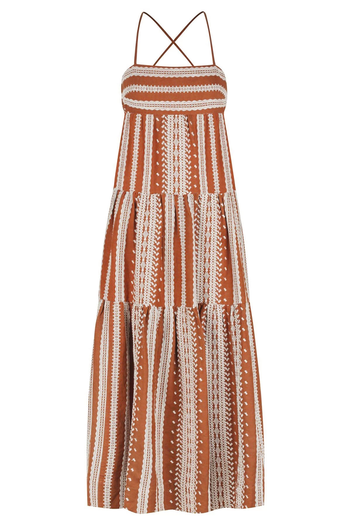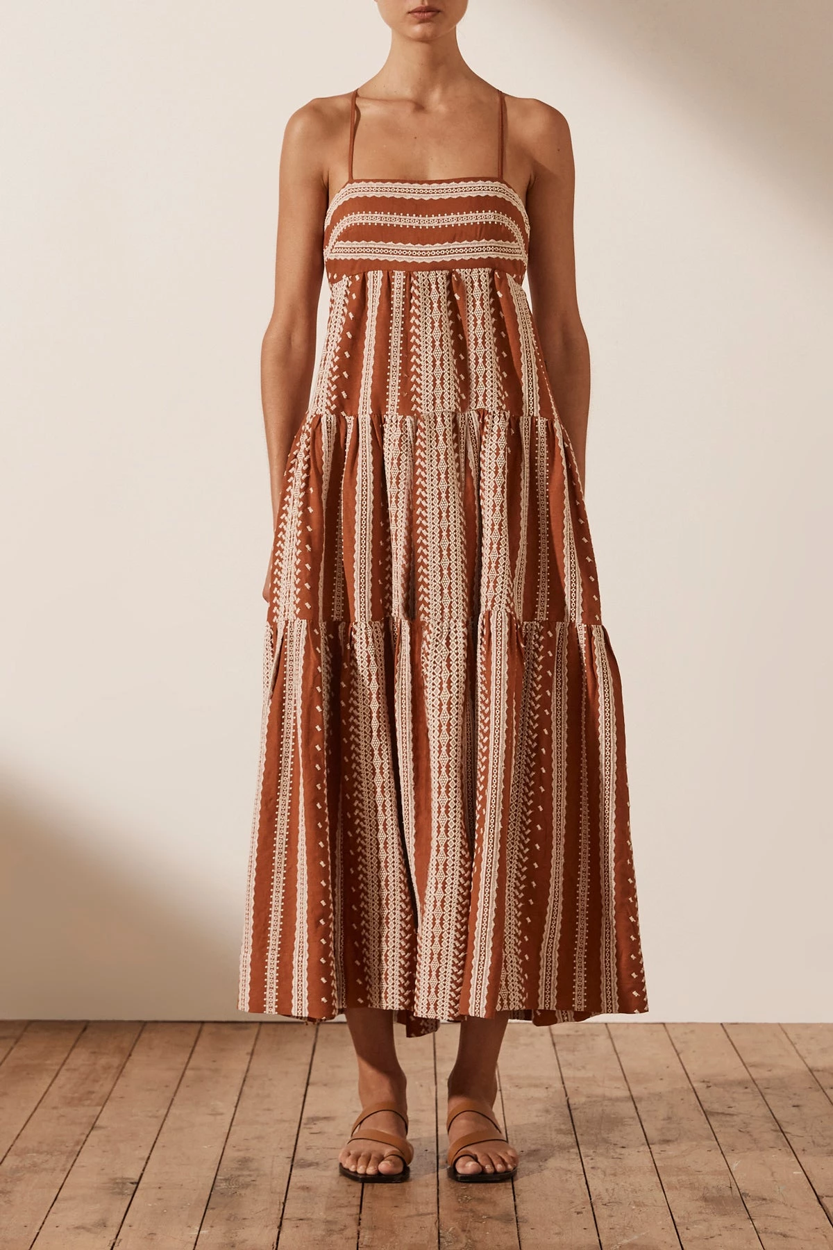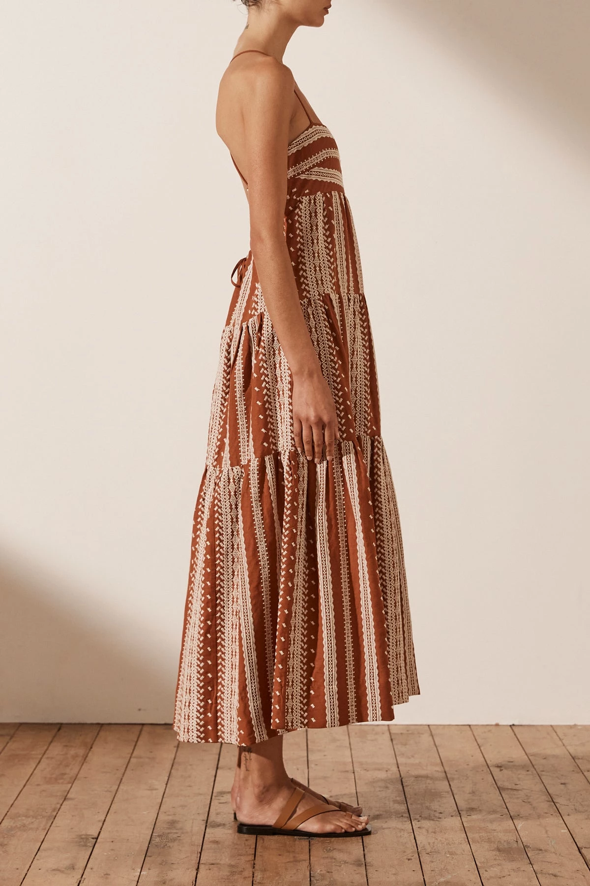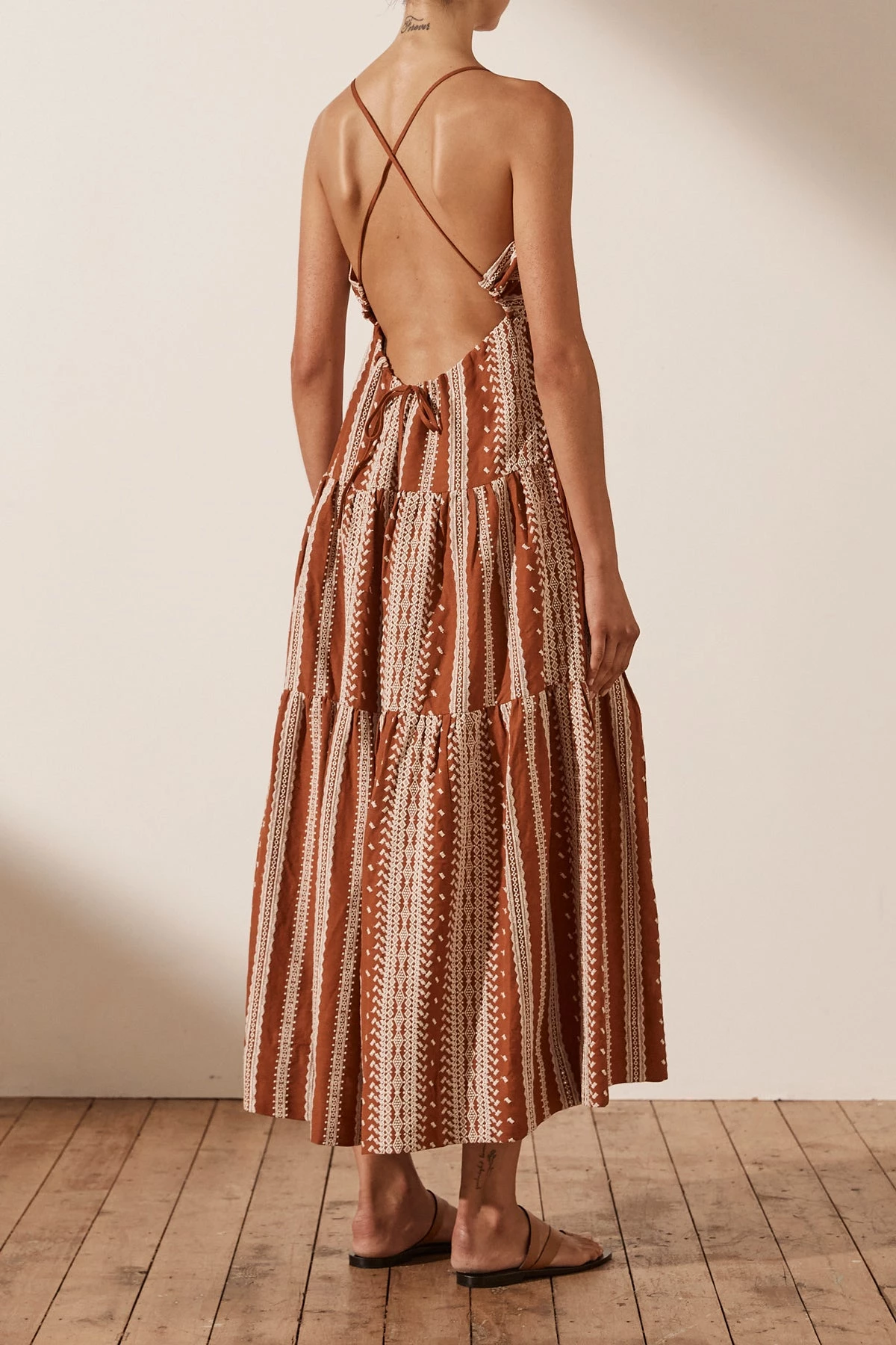 Shona Joy ATLAS LINEN BACKLESS TIERED MIDI DRESS – PAPRIKA/CREAM