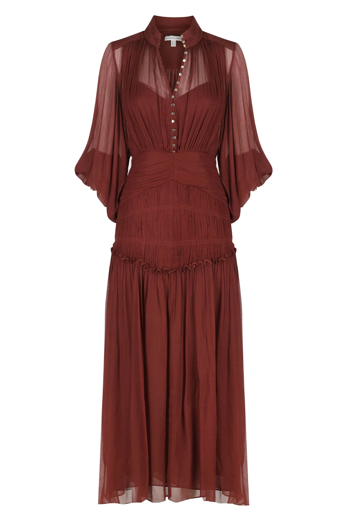 Balloon sleeve ruched midi dress in a light weight semi-sheer chiffon.