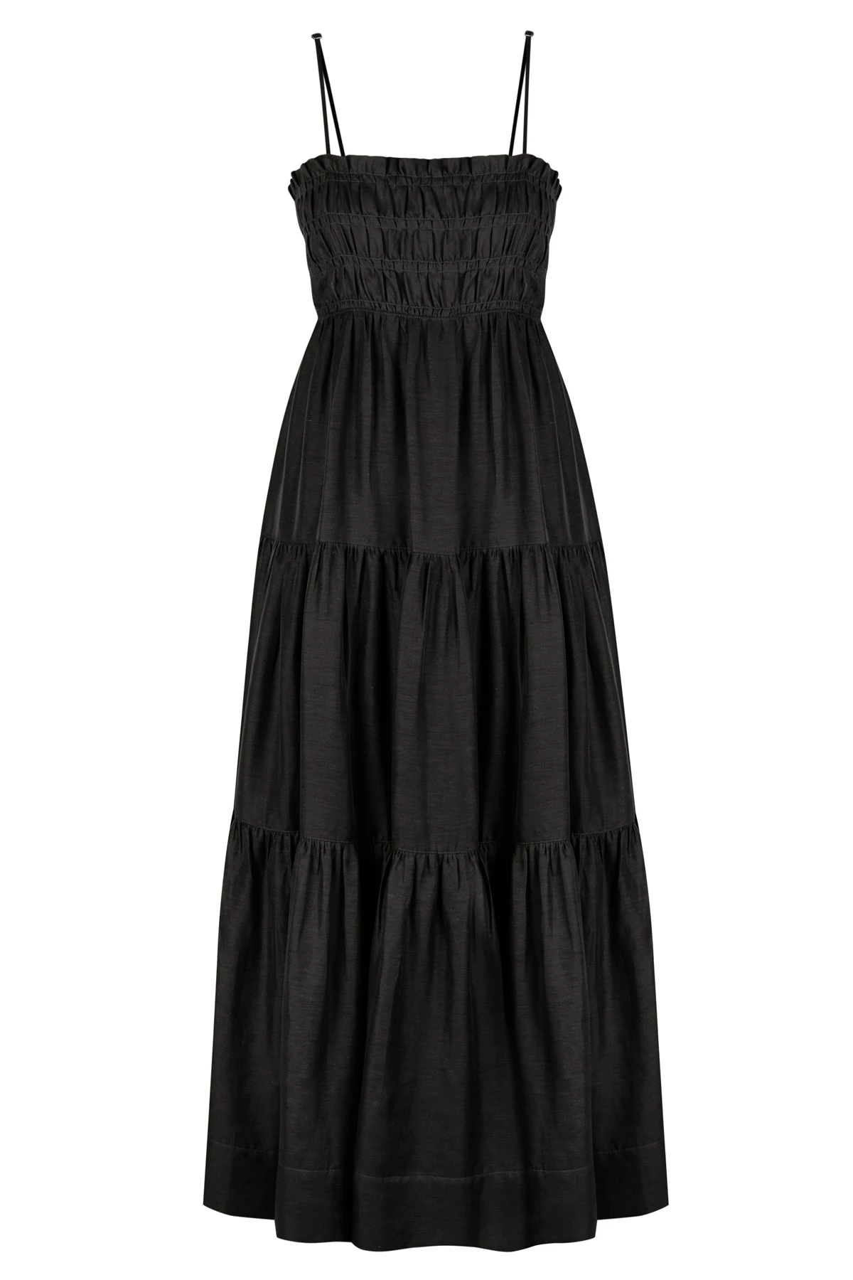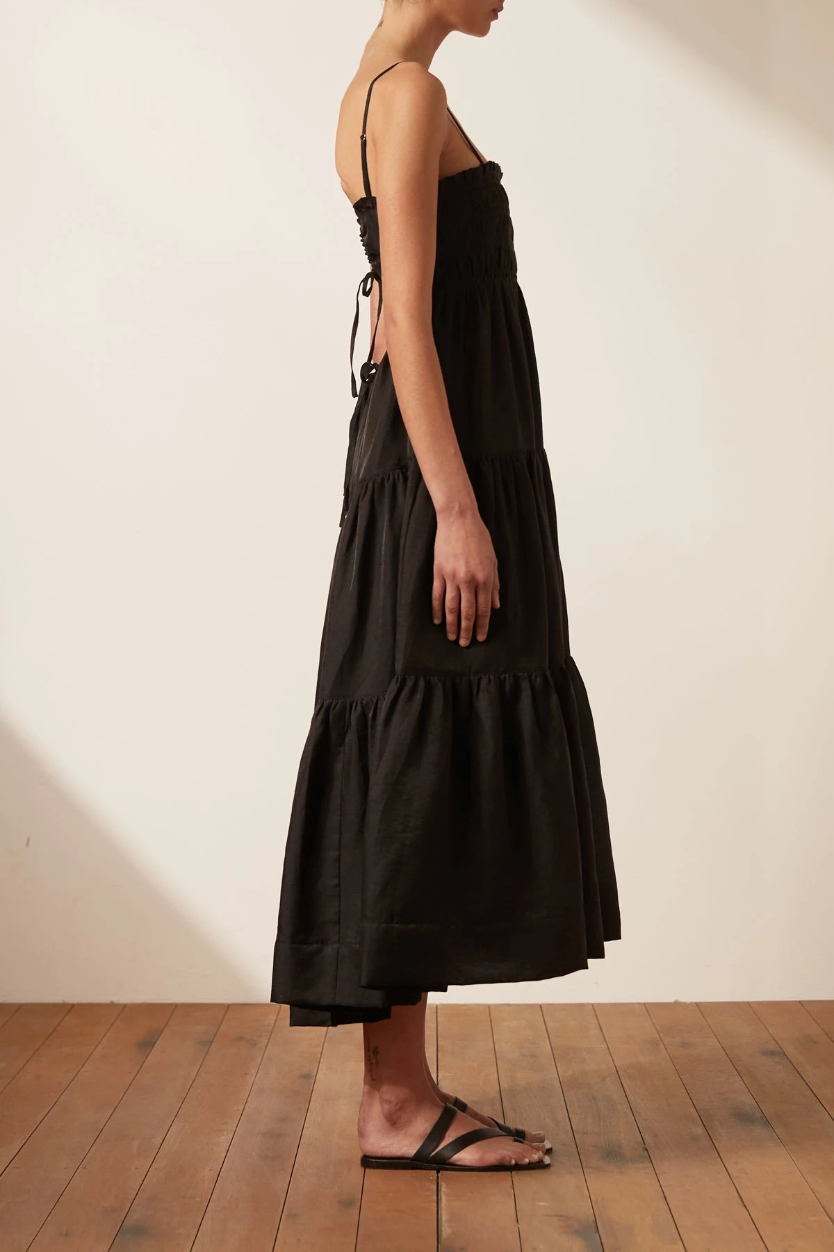 Shona Joy BRUNA LINEN OPEN BACK SHIRRED MIDI DRESS – BLACK