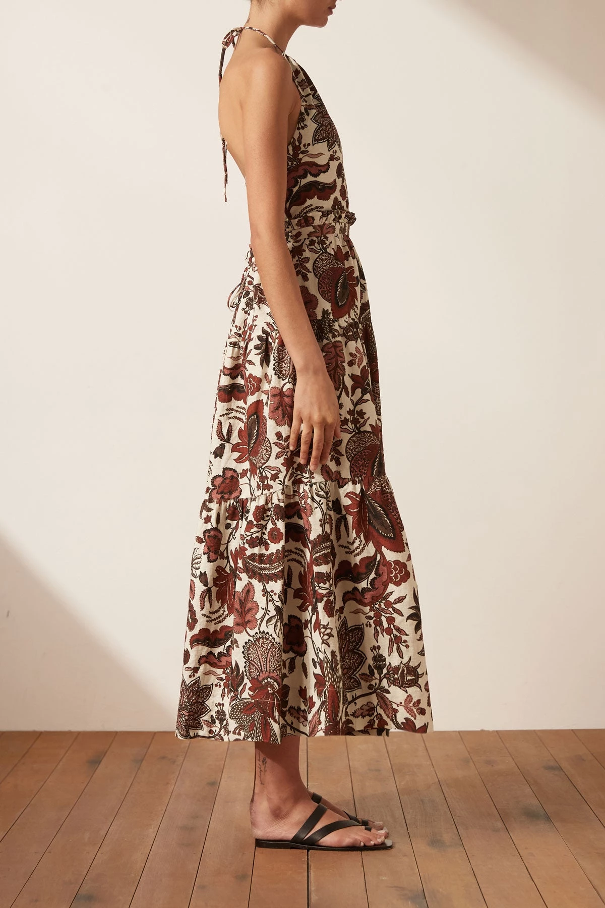 Open back halter midi dress in a premium cotton-linen blend in the exclusive Catalina print.