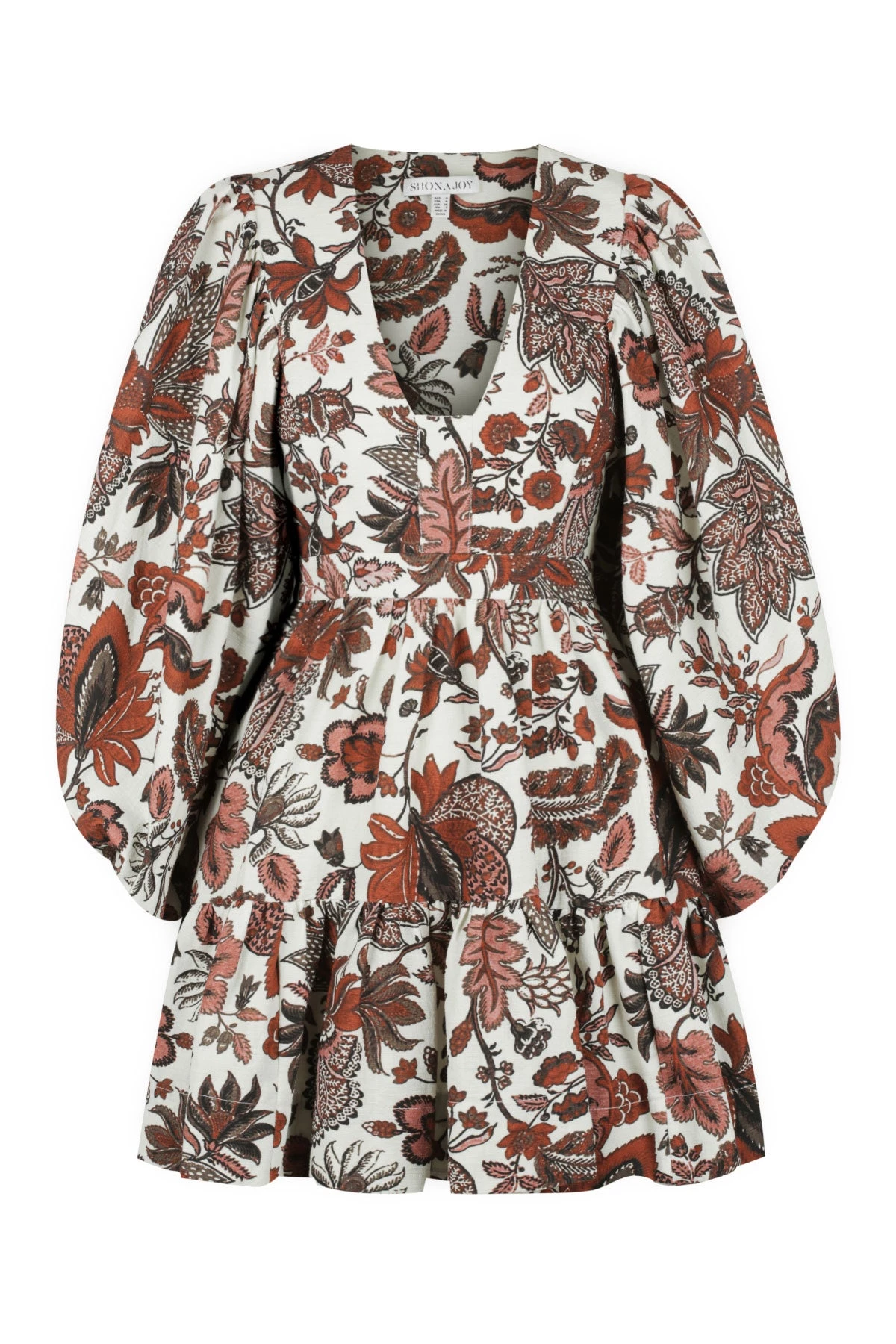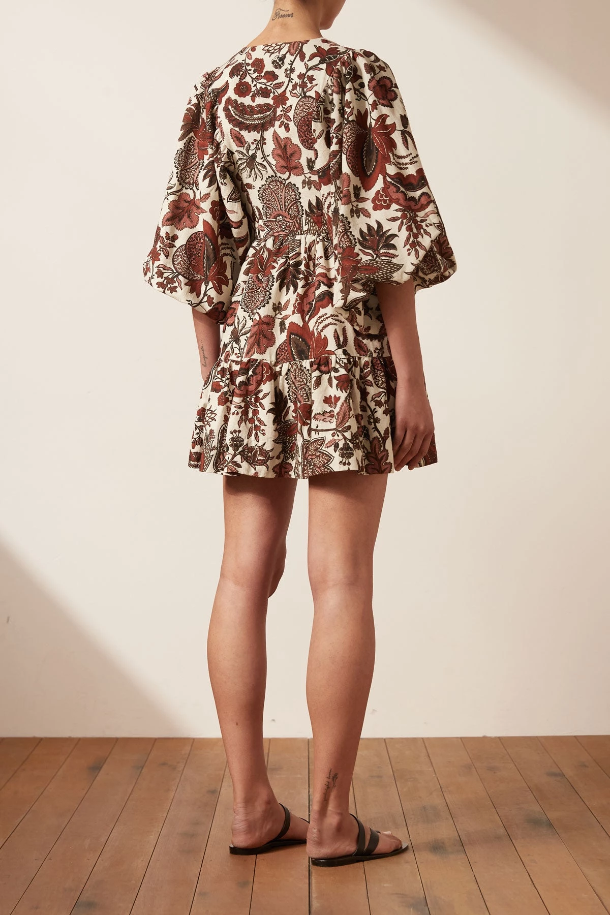 Plunged balloon sleeve mini dress in a premium cotton-linen blend in the exclusive Catalina print.