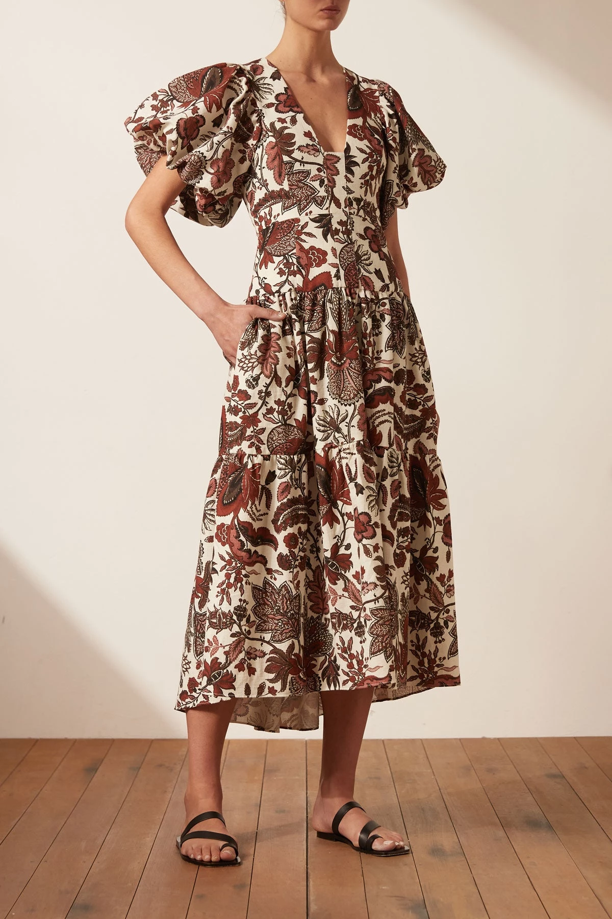 Plunged short balloon sleeve midi dress in a premium cotton-linen blend in the exclusive Catalina print.
