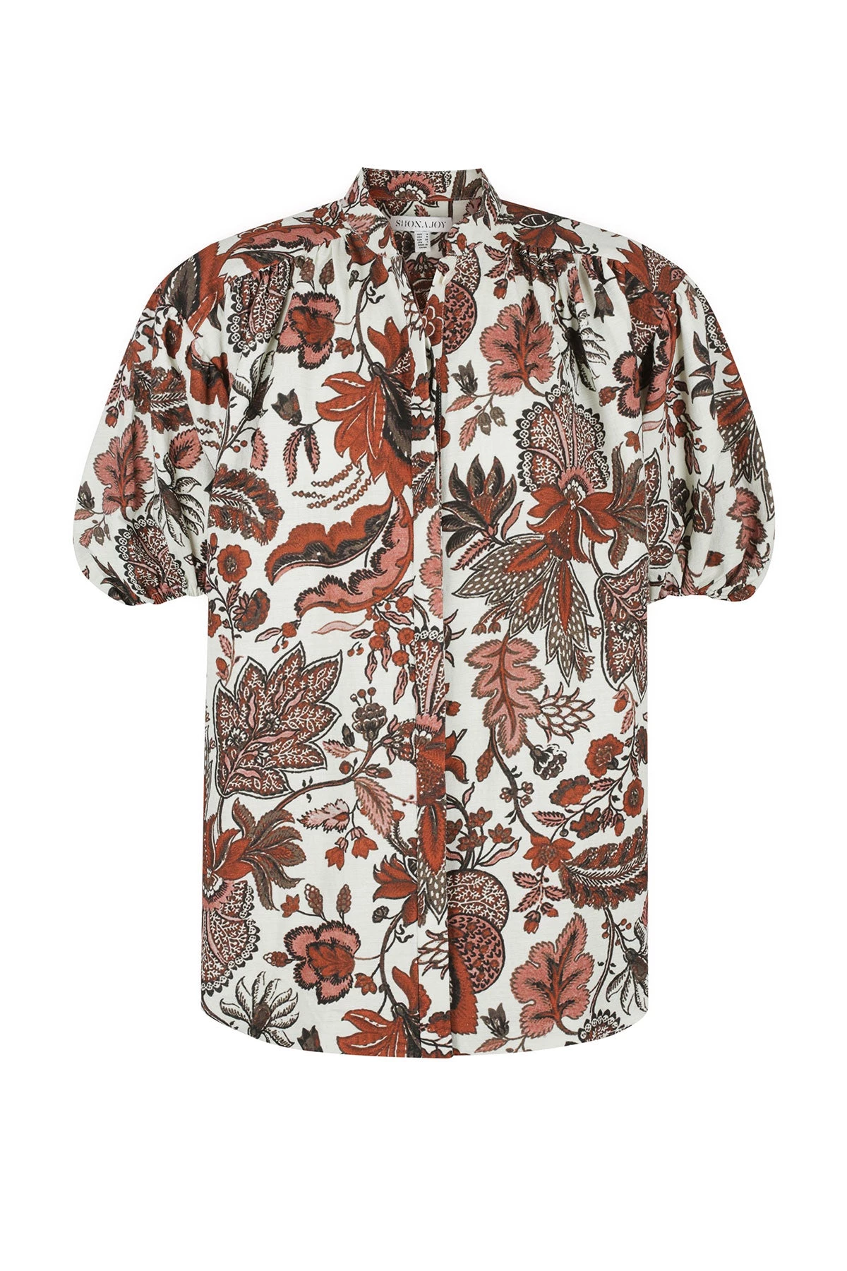 Stand collar balloon sleeve shirt in a premium cotton-linen blend in the exclusive Catalina print.