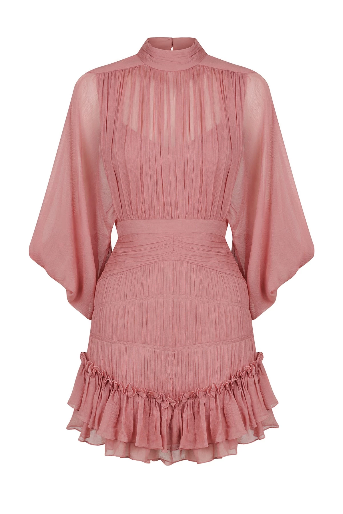 Long sleeve mini dress in a light weight semi-sheer chiffon.