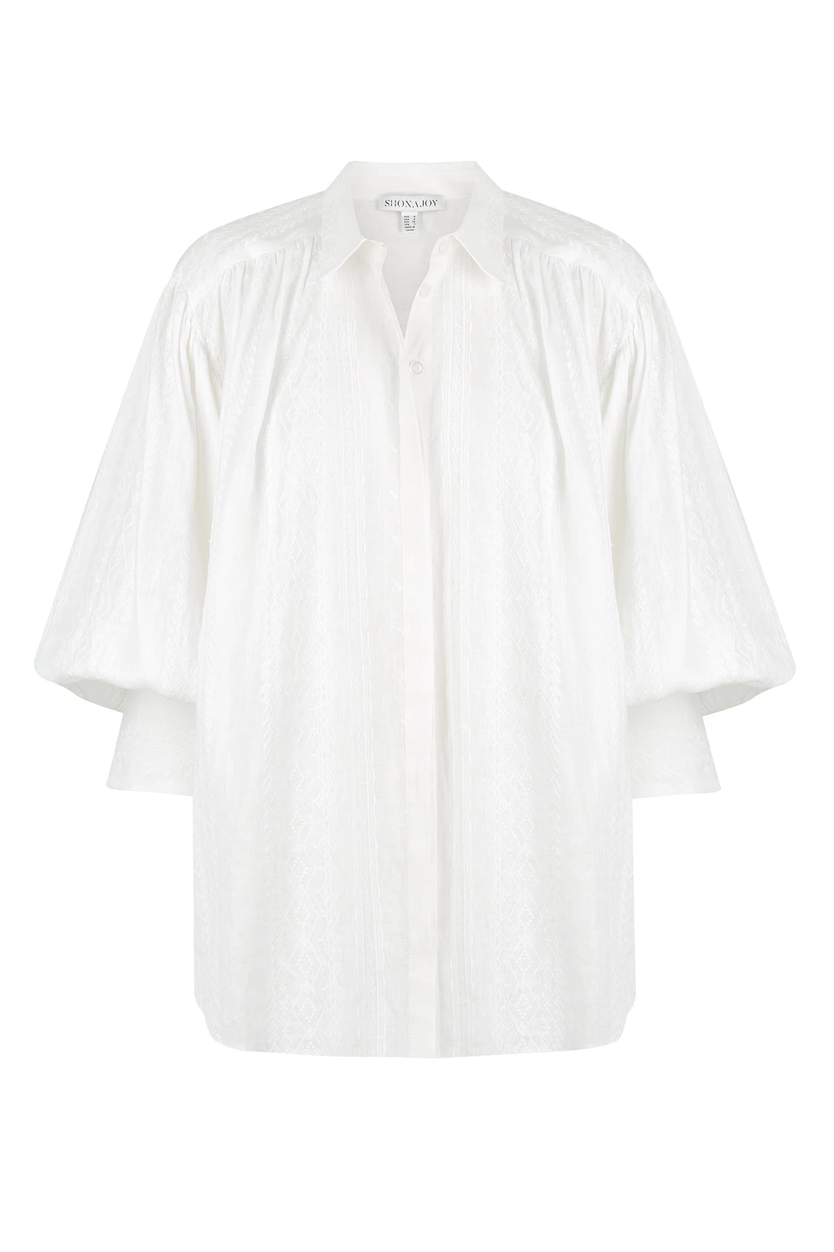 Button up balloon sleeve shirt in a linen blend with cotton embroidery.