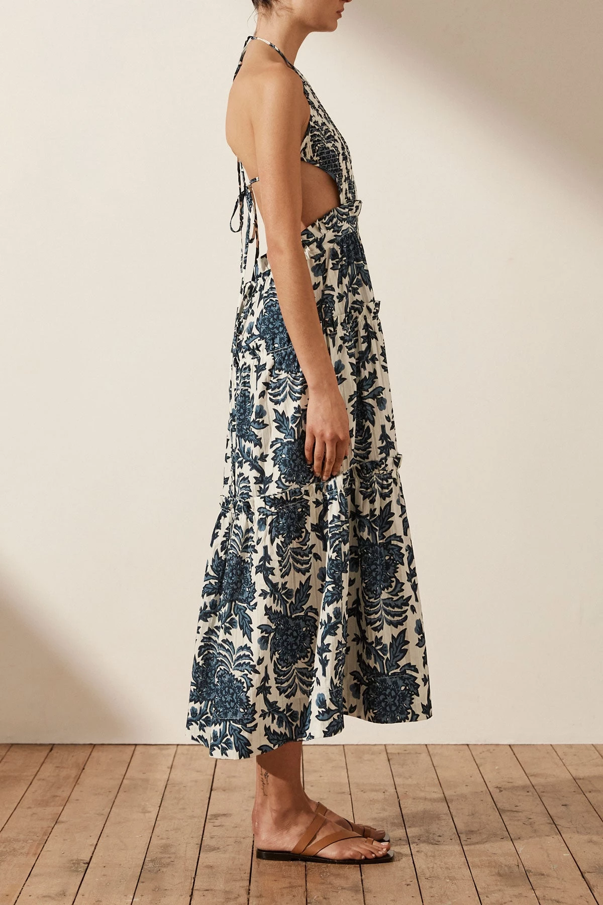 Shirred backless midi dress in a self stripe cotton in the exclusive Diana print.