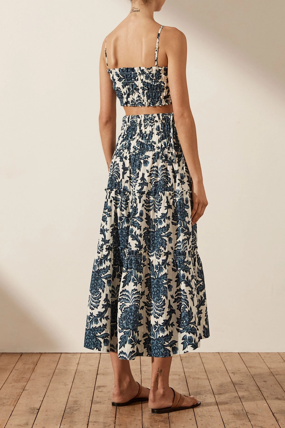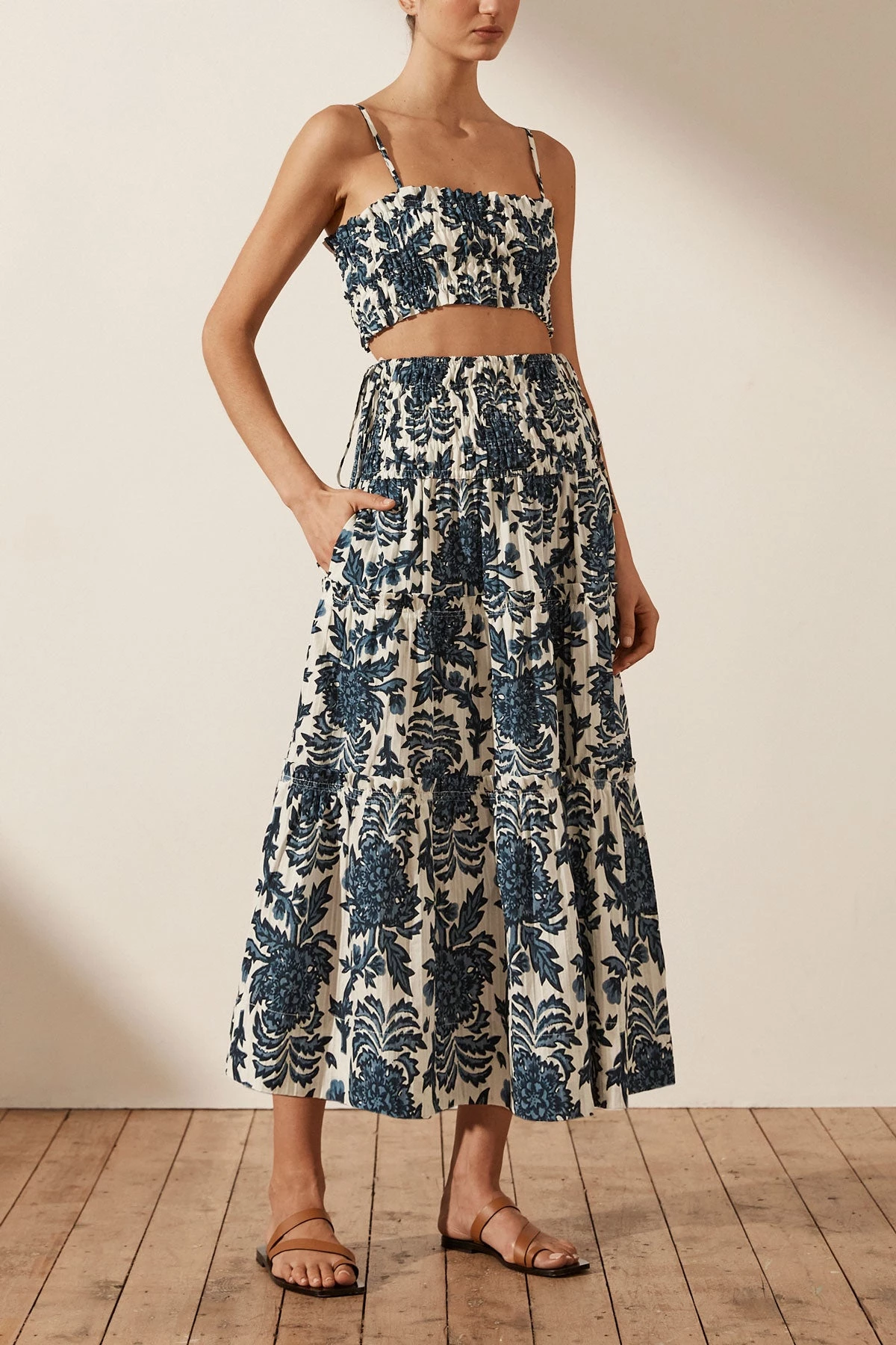 Shirred midi skirt in a self stripe cotton in the exclusive Diana print.