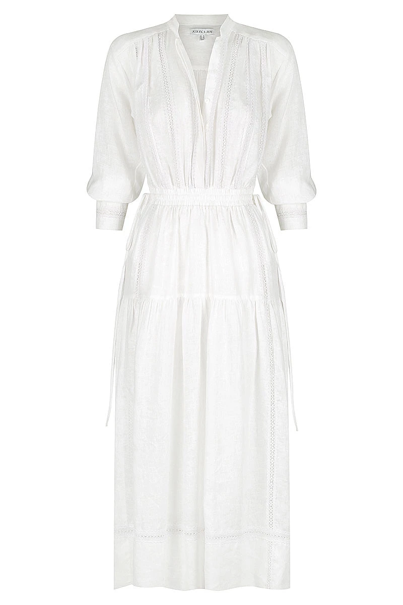 Long sleeve midi dress with lace trims throughout in a pure semi-sheer textured linen.