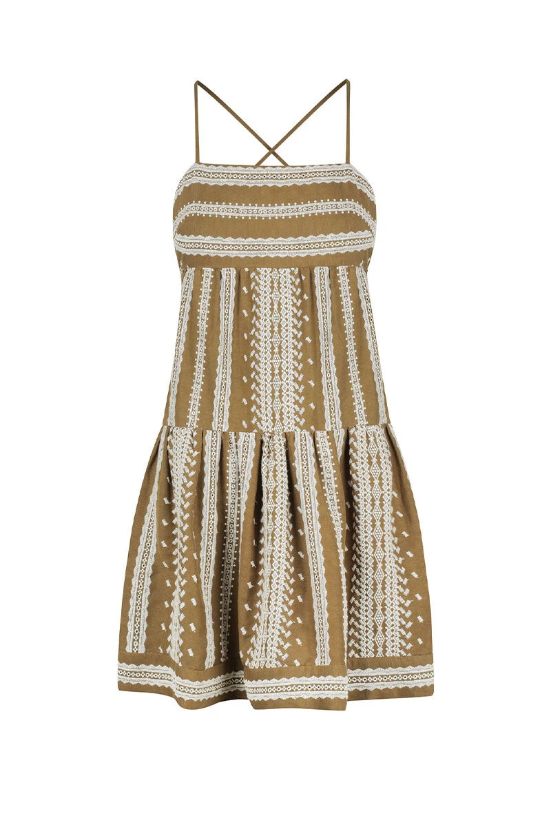 Shona Joy DRESSES ATLAS LINEN BACKLESS TIERED MINI DRESS – CUMIN/CREAM
