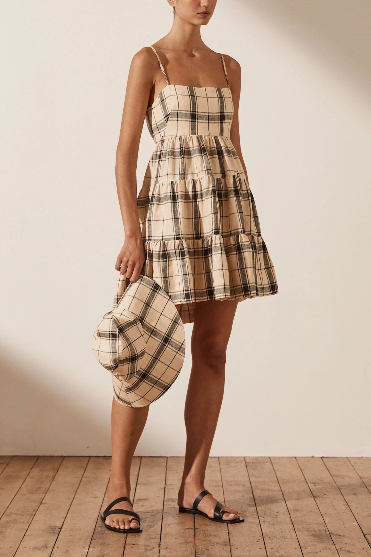 Open back tiered mini dress in a pure textured linen in the exclusive Indra check print.
