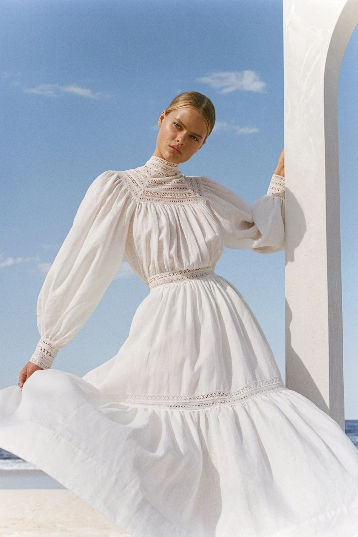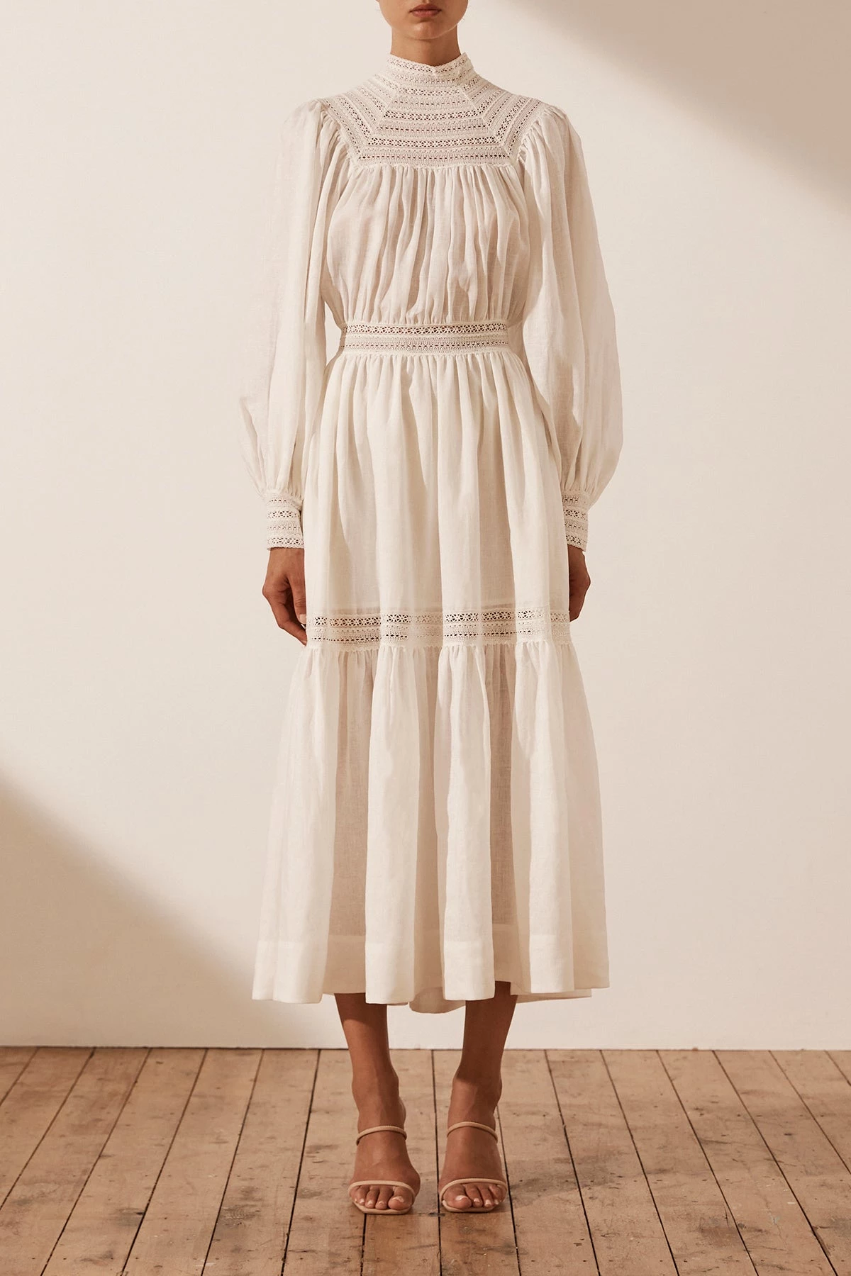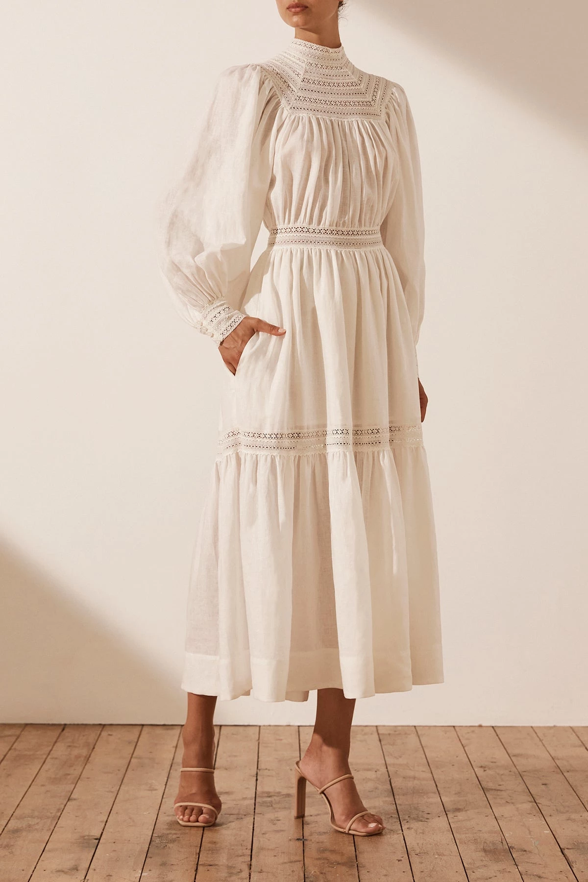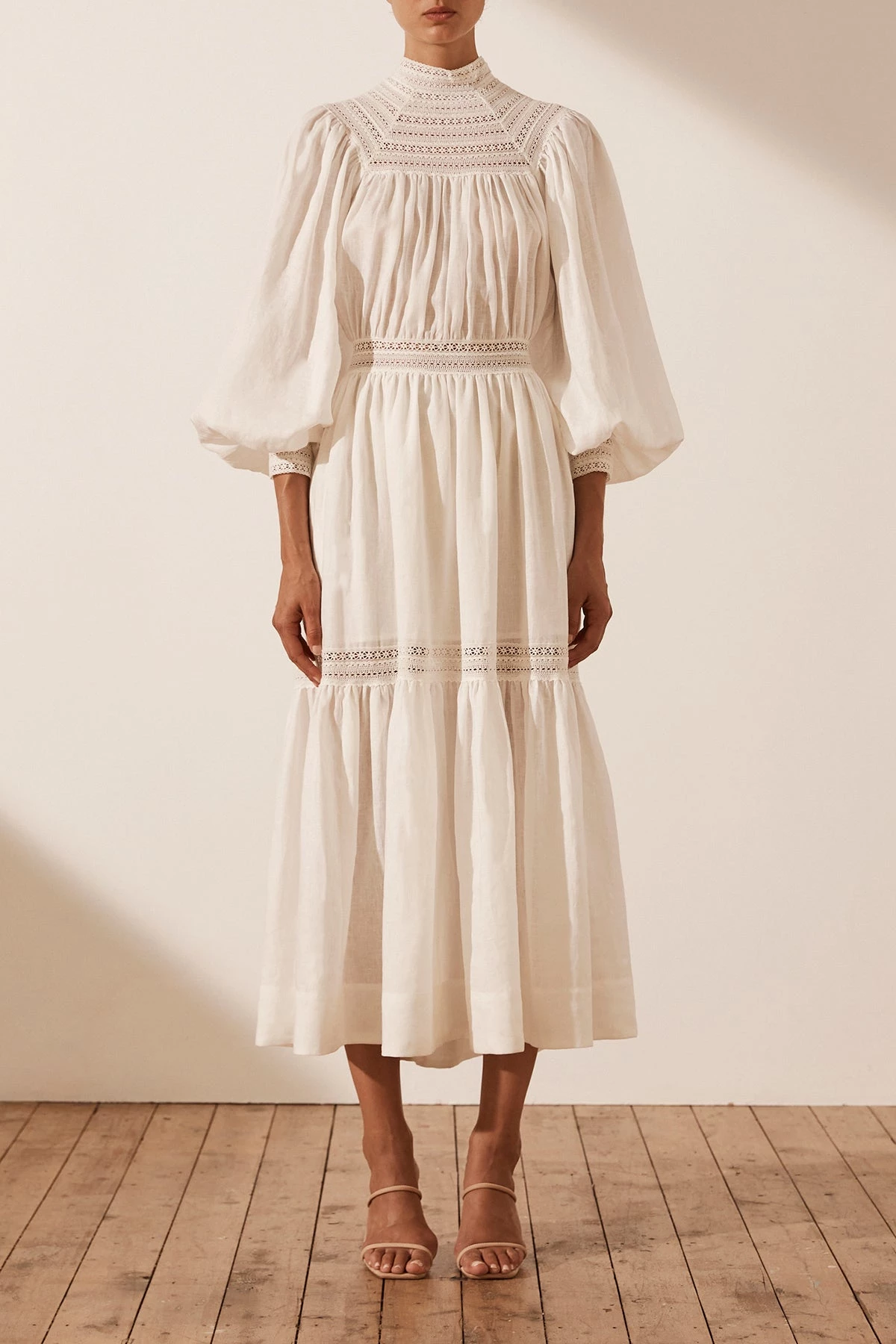 Shona Joy DRESSES LOLA LINEN HIGH NECK BALLOON SLEEVE MIDI DRESS – RICE