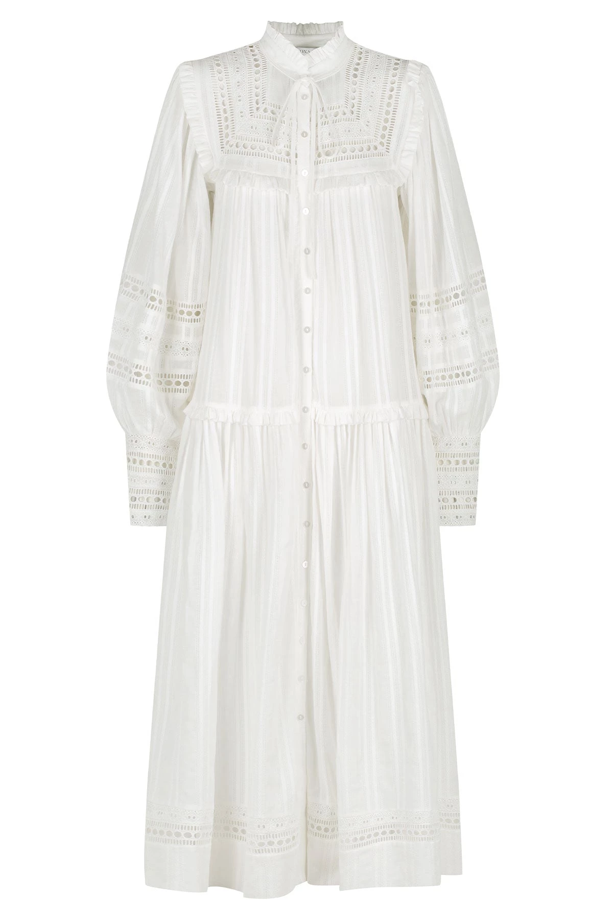High neck balloon sleeve frill midi dress with lace trims in a stripe cotton jacquard.