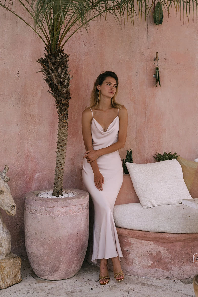 Bias cowl slip dress in a light weight silk touch fabric.