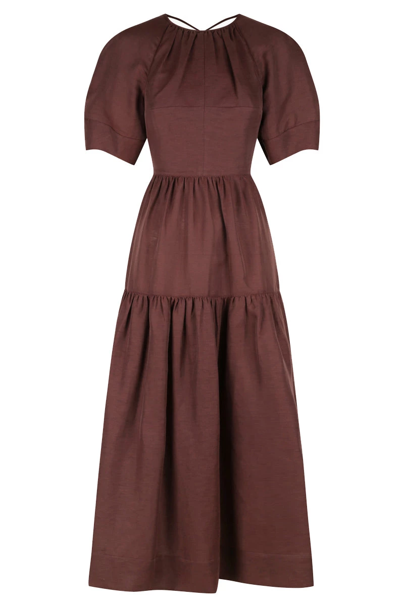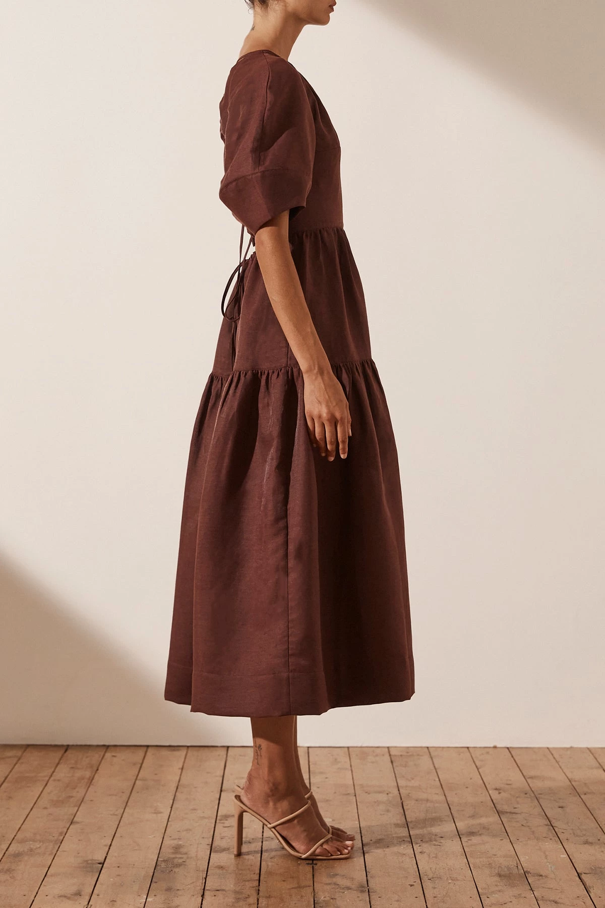 Shona Joy DRESSES MARLENE LINEN SHORT SLEEVE OPEN BACK MIDI DRESS – CHOCOLATE