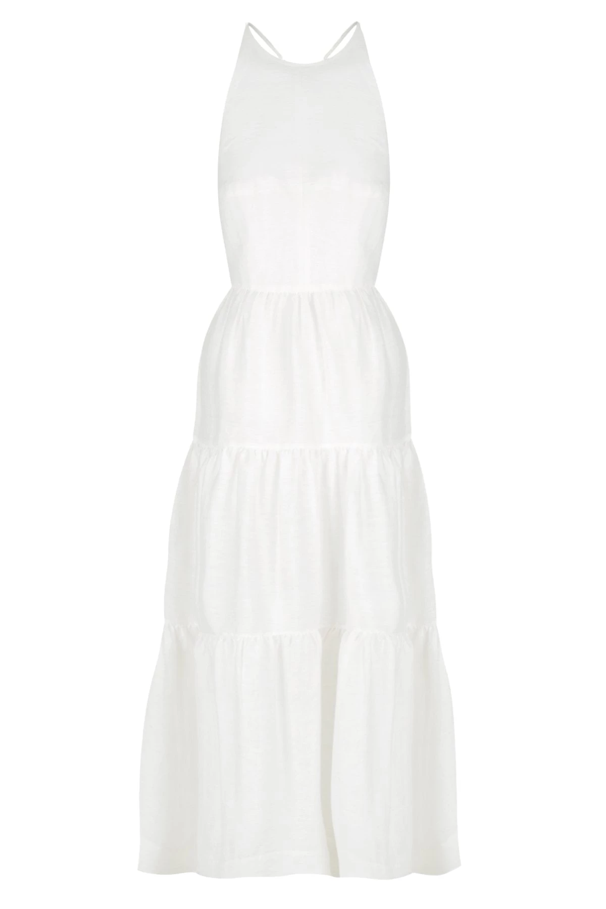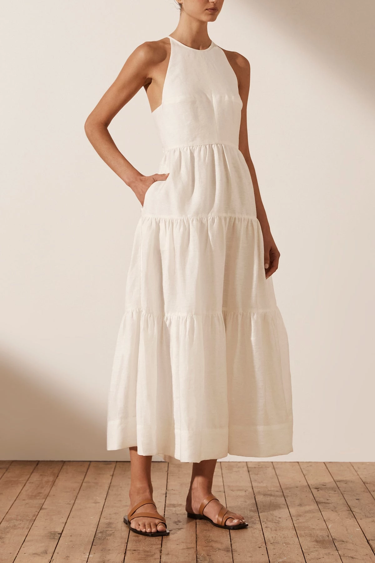 Halter tiered midi dress with back cut out detail in a luxurious linen blend with a slight sheen.