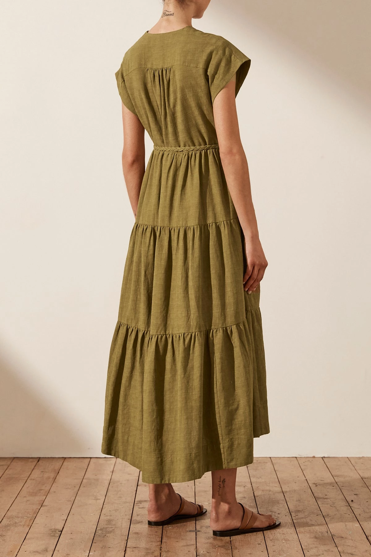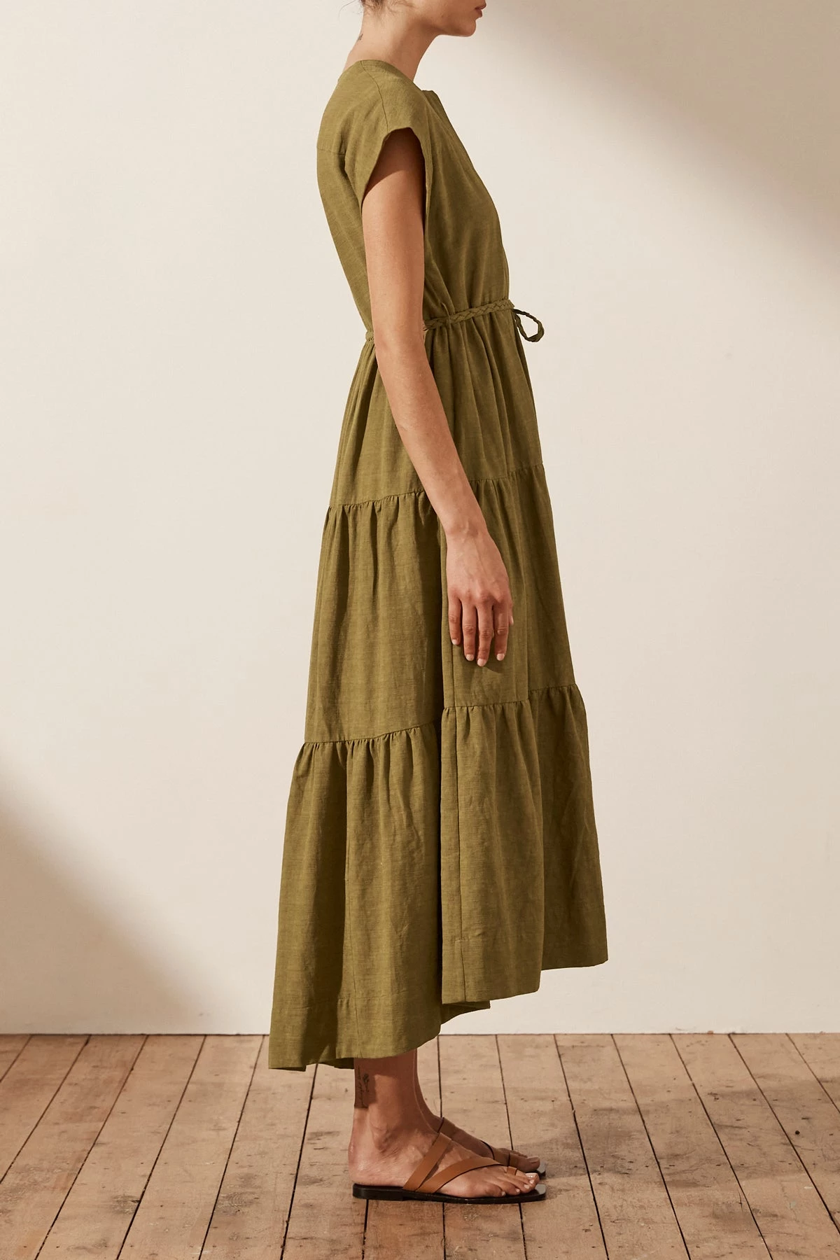 Tiered midi dress with braid belt in a premium cotton-linen blend.
