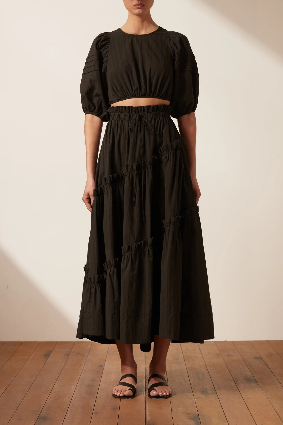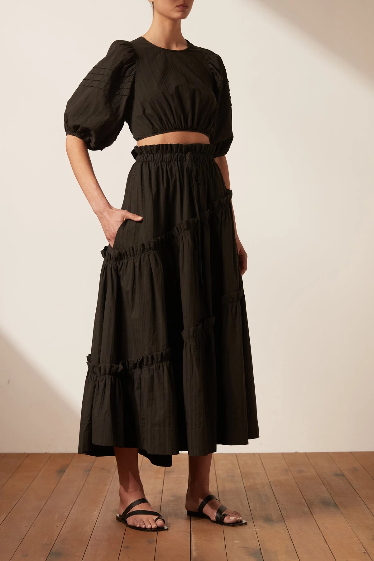 Shona Joy ELLA DRAWSTRING ASYMMETRIC MIDI SKIRT – COAL SKIRTS