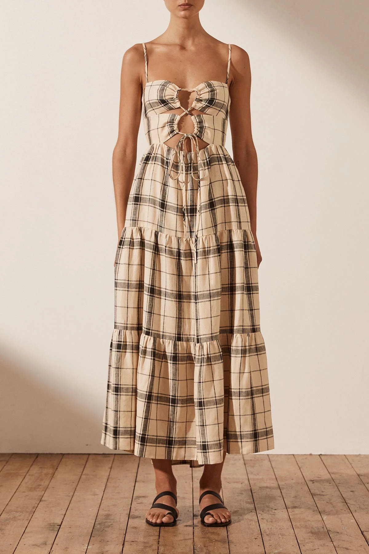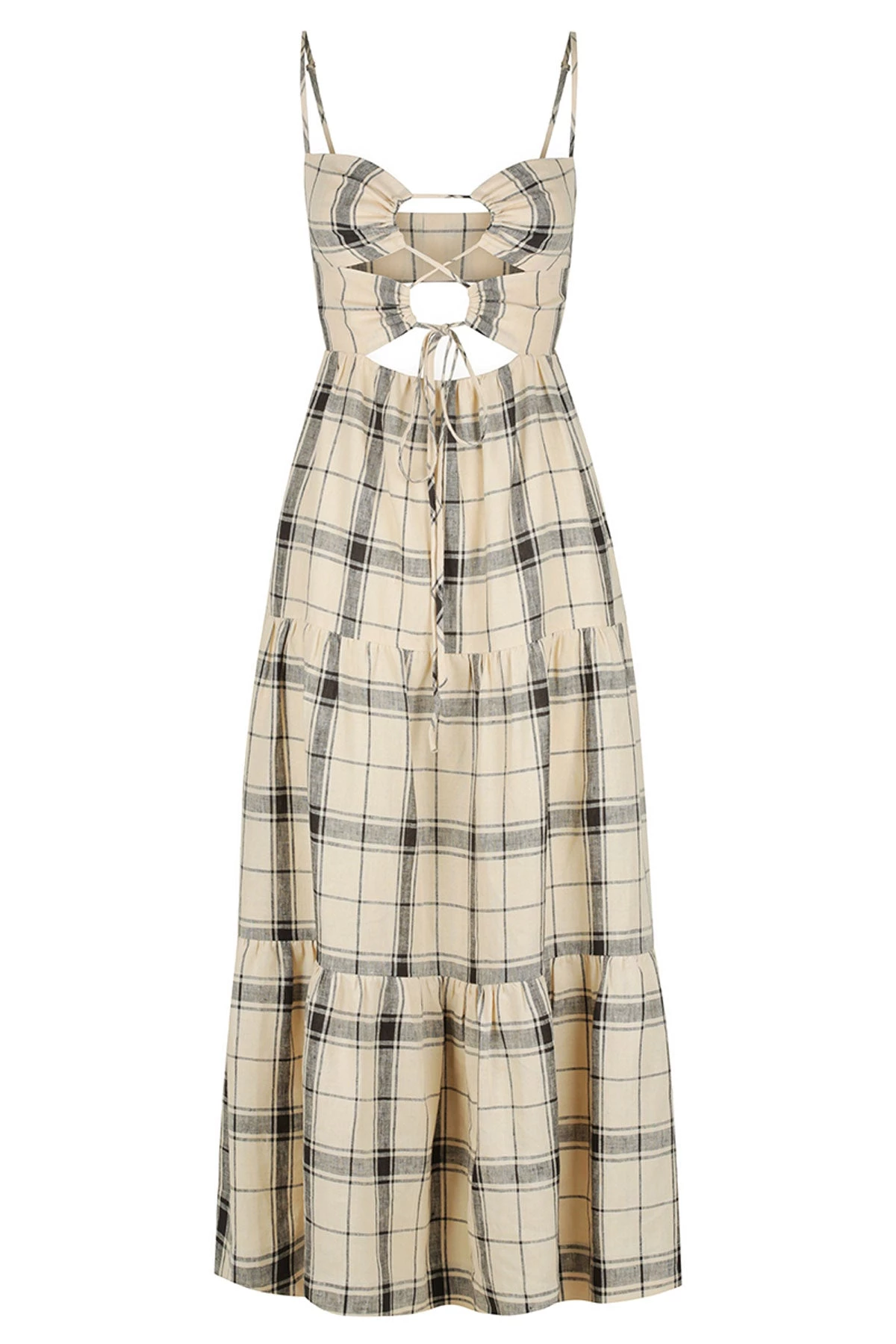 SKU: Summer 21 6616811602054 Category: DRESSES Tags: Casual Dresses, Colour_tone: neutral, Fabric: atticus, Print_type: check, Sibling|rubi-linen-lace-up-backless-midi-dress-cocoa