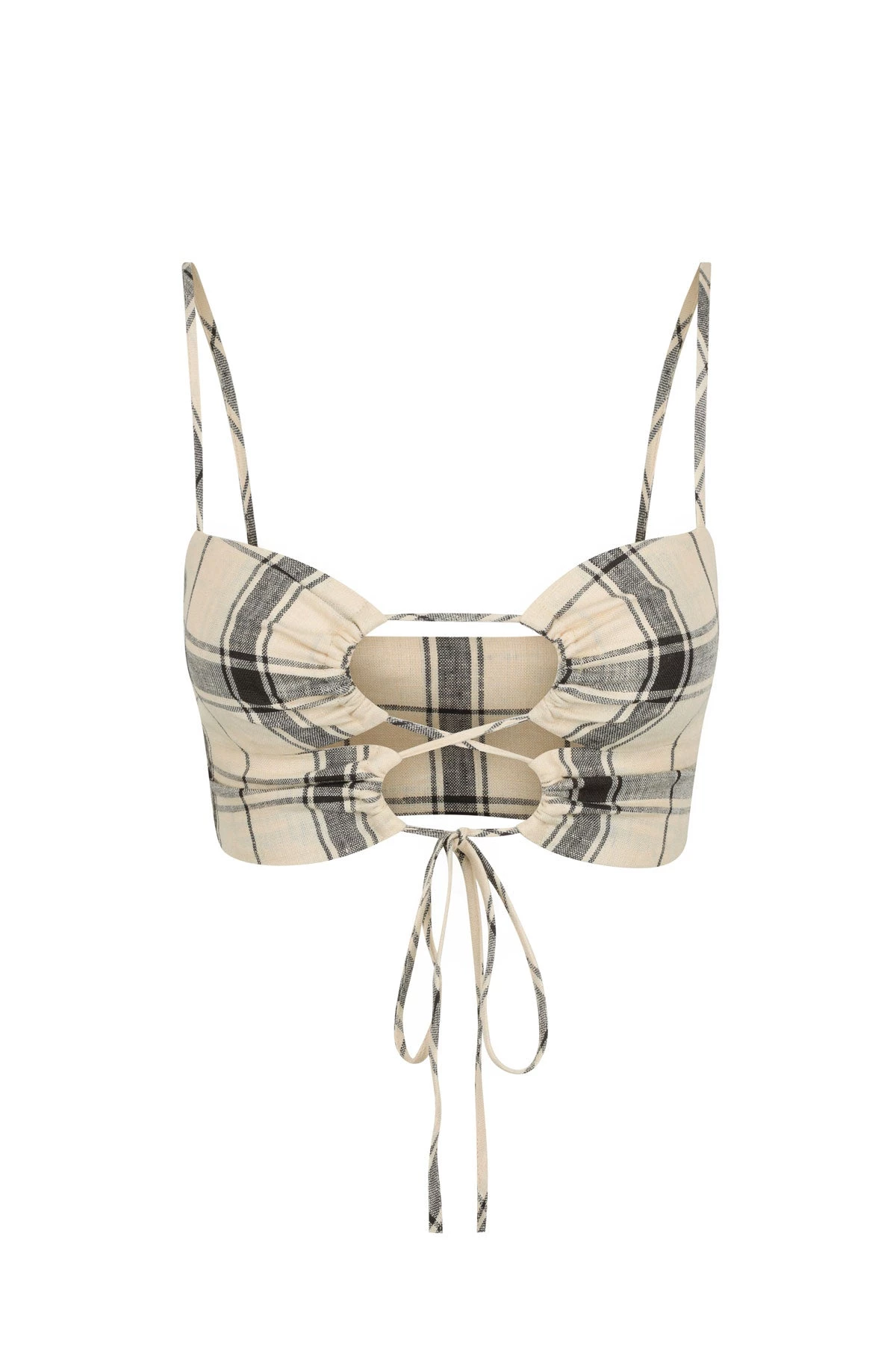 Lace up bralette in a pure textured linen in the exclusive Indra check print.