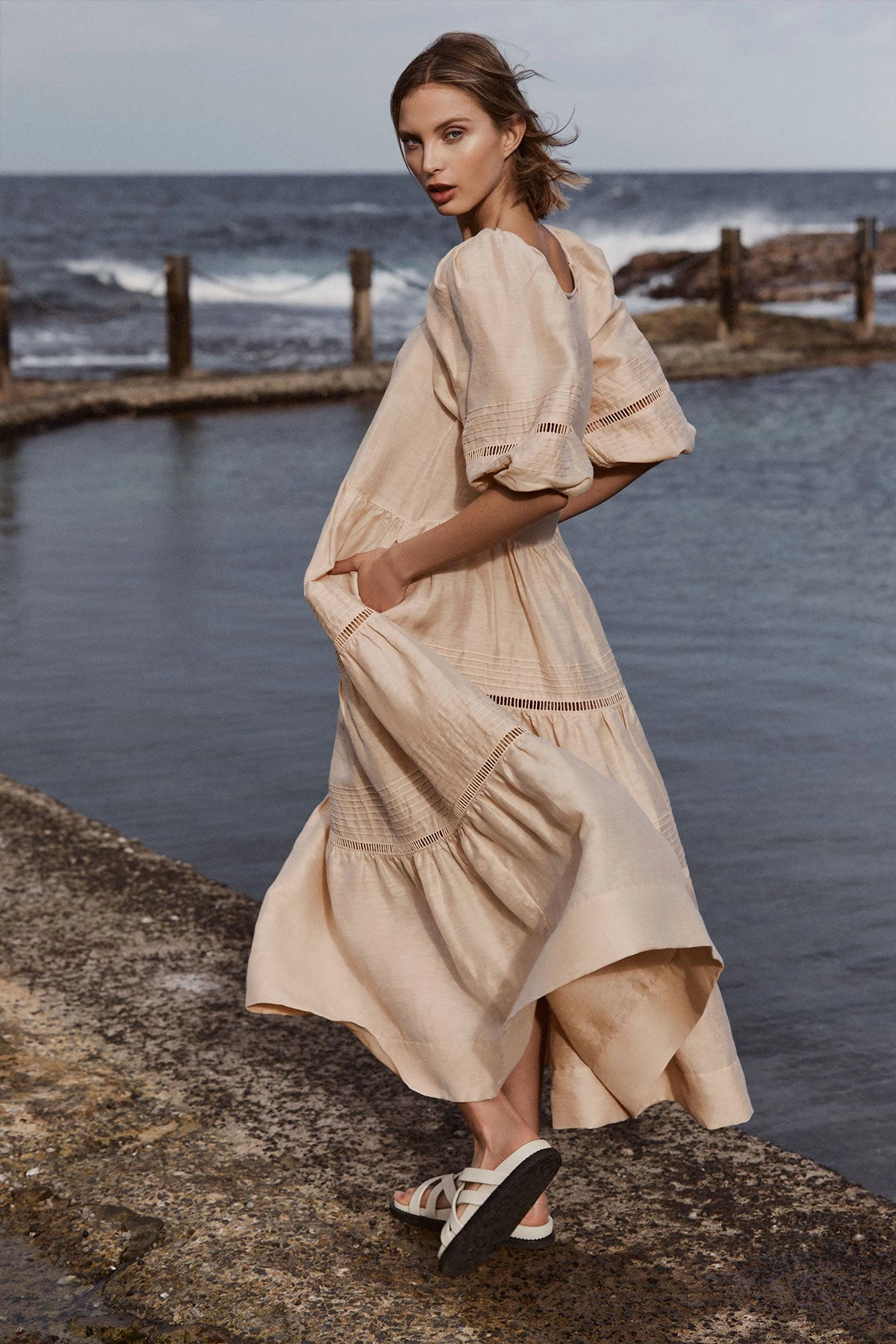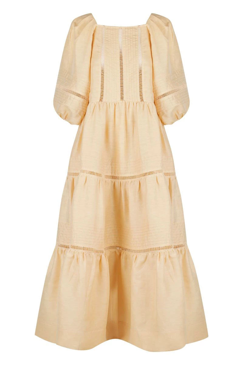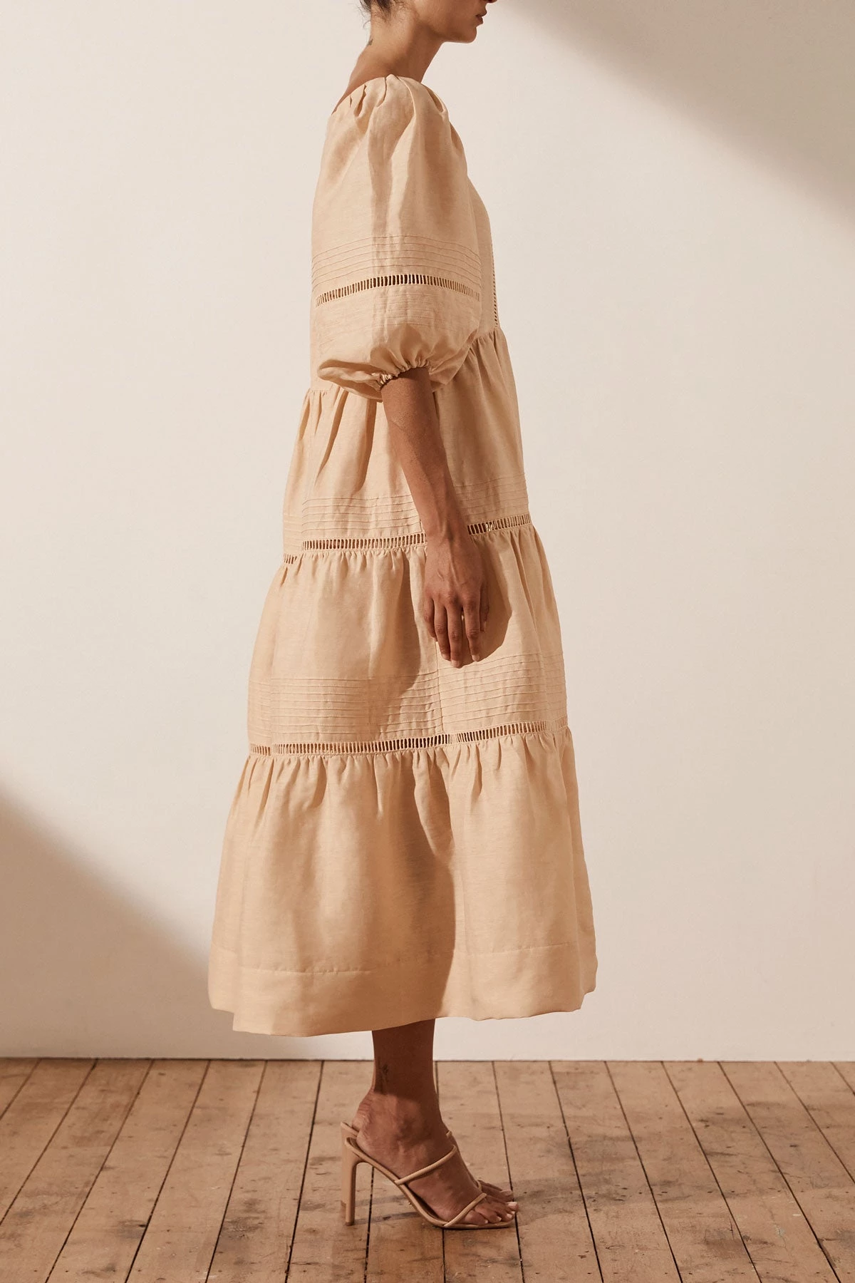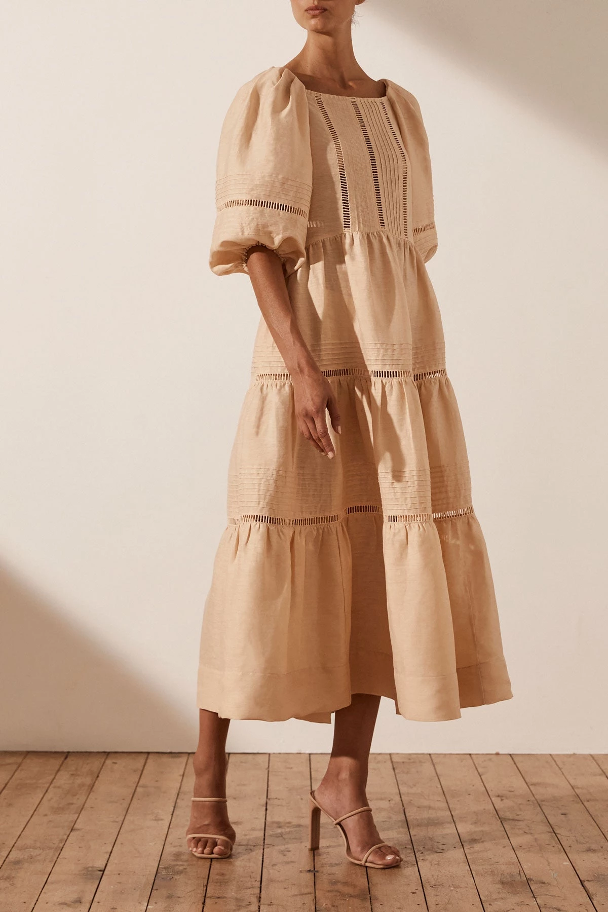 Shona Joy JOIA LINEN PIN TUCK PUFF SLEEVE MIDI DRESS – BISCUIT