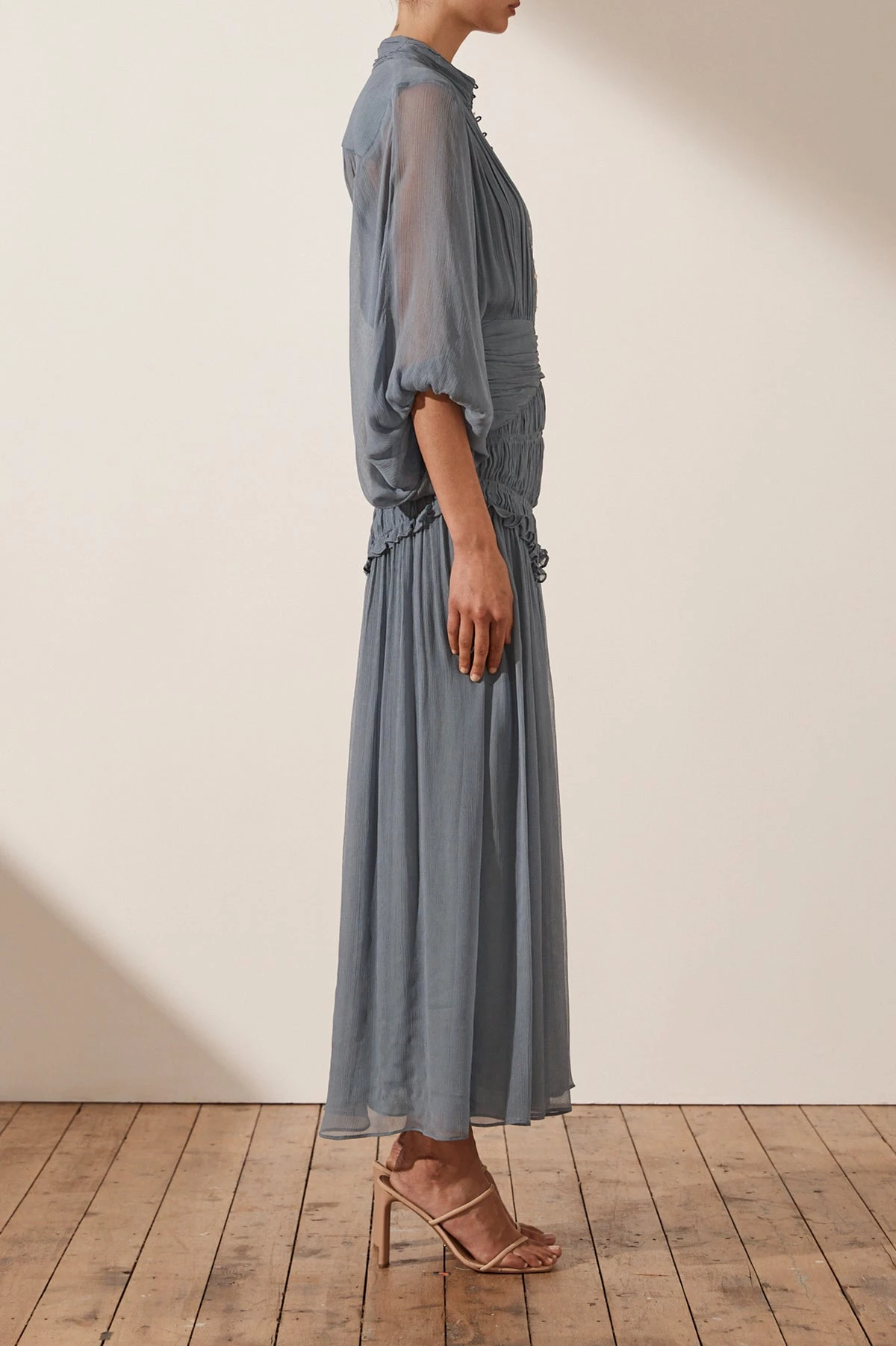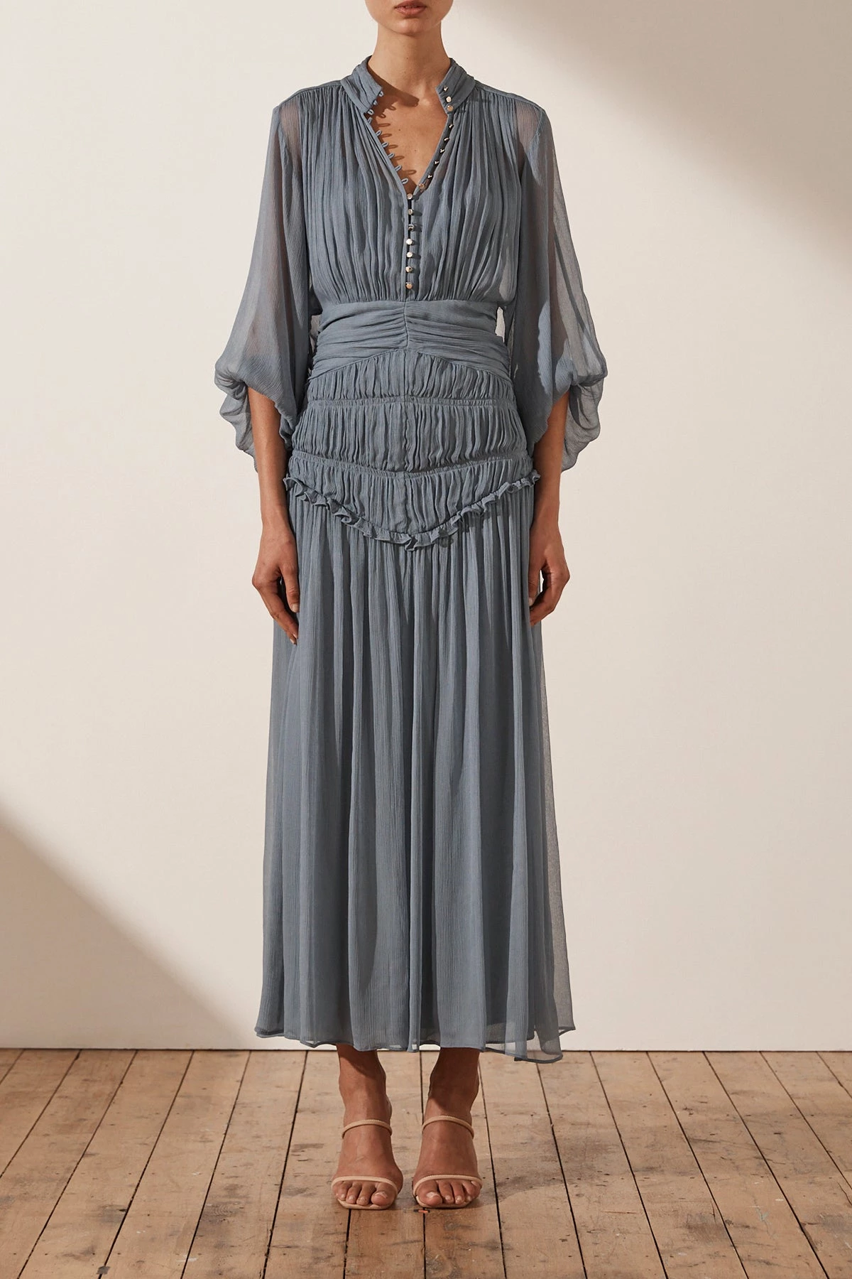 Shona Joy KAYLA BUTTON UP RUCHED MIDI DRESS – BLUE SMOKE