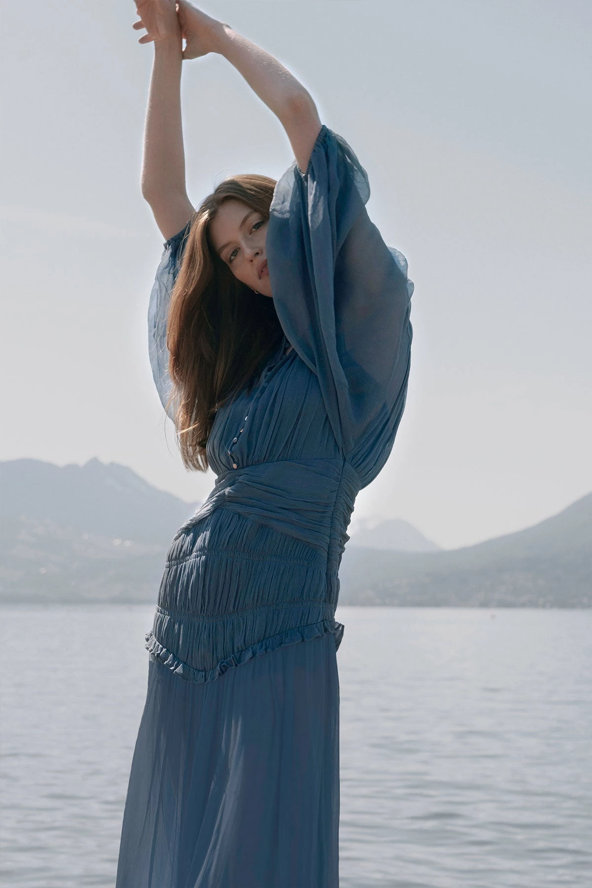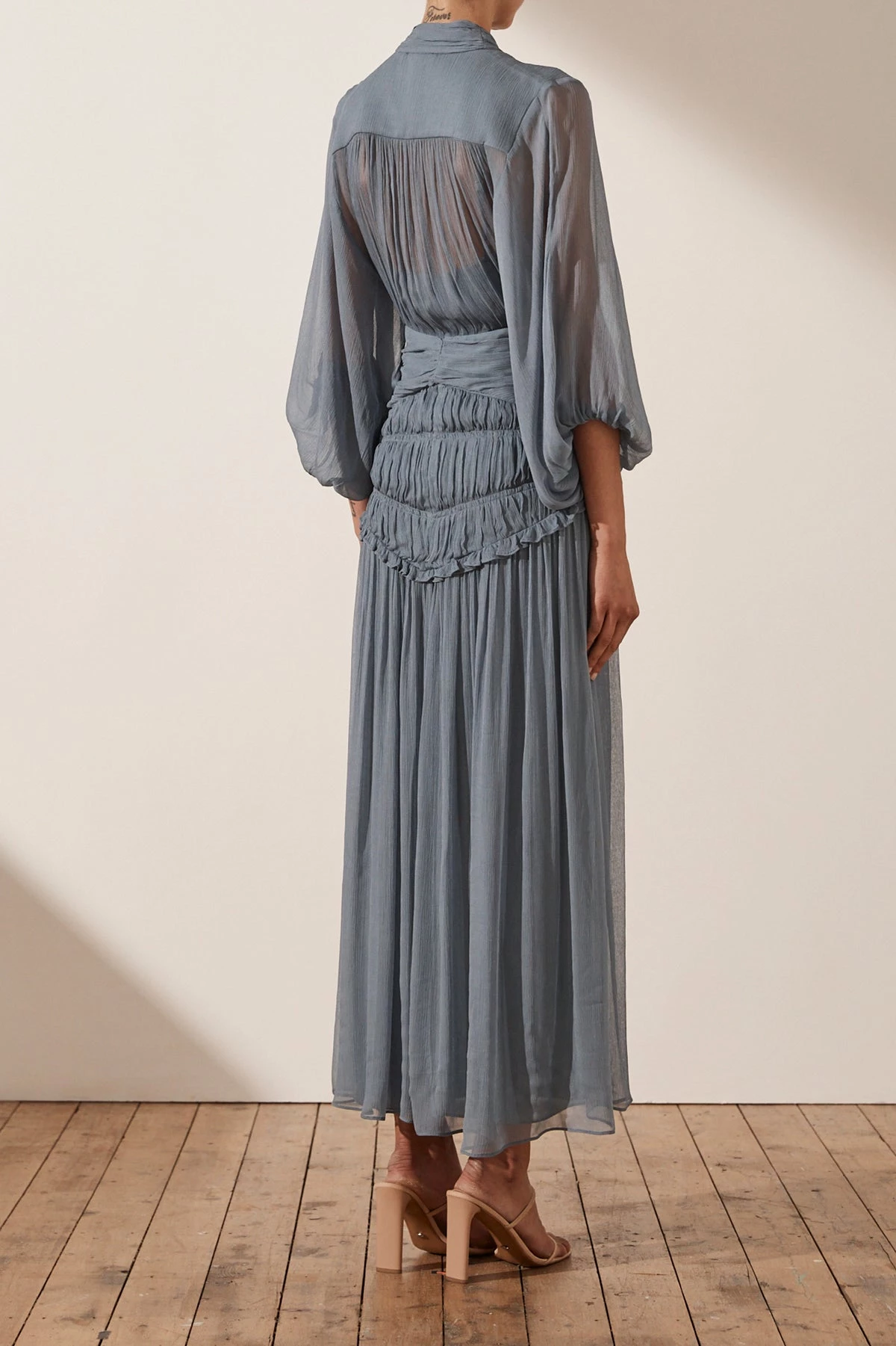 Balloon sleeve ruched midi dress in a light weight semi-sheer chiffon.