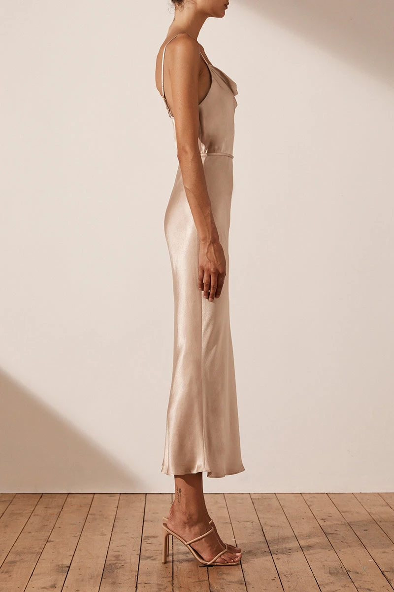 Bias cowl midi dress in a silk touch fabric with a luxurious sheen.