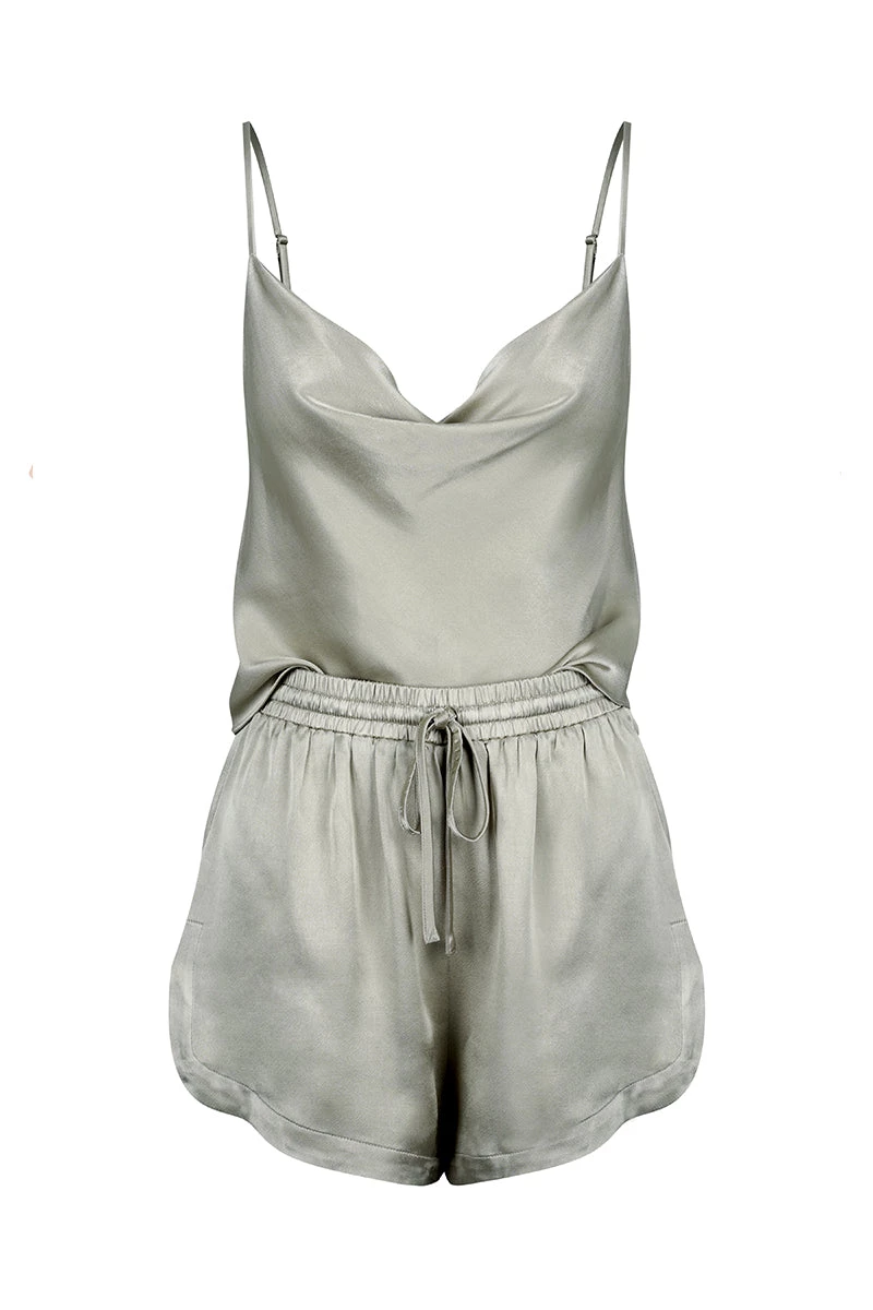 Cowl cami lounge set with matching drawstring bag in a silk touch fabric with a luxurious sheen.