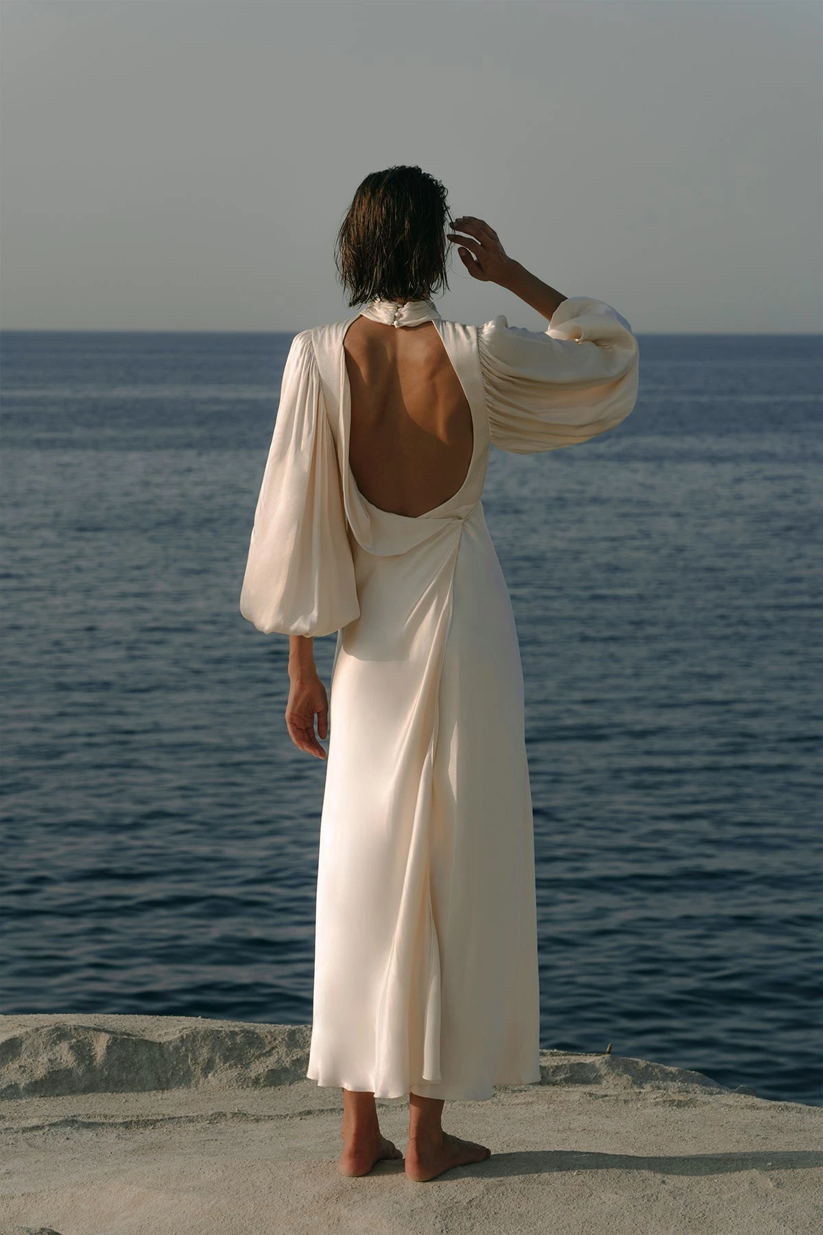 Backless midi dress in a silk touch fabric with a luxurious sheen.