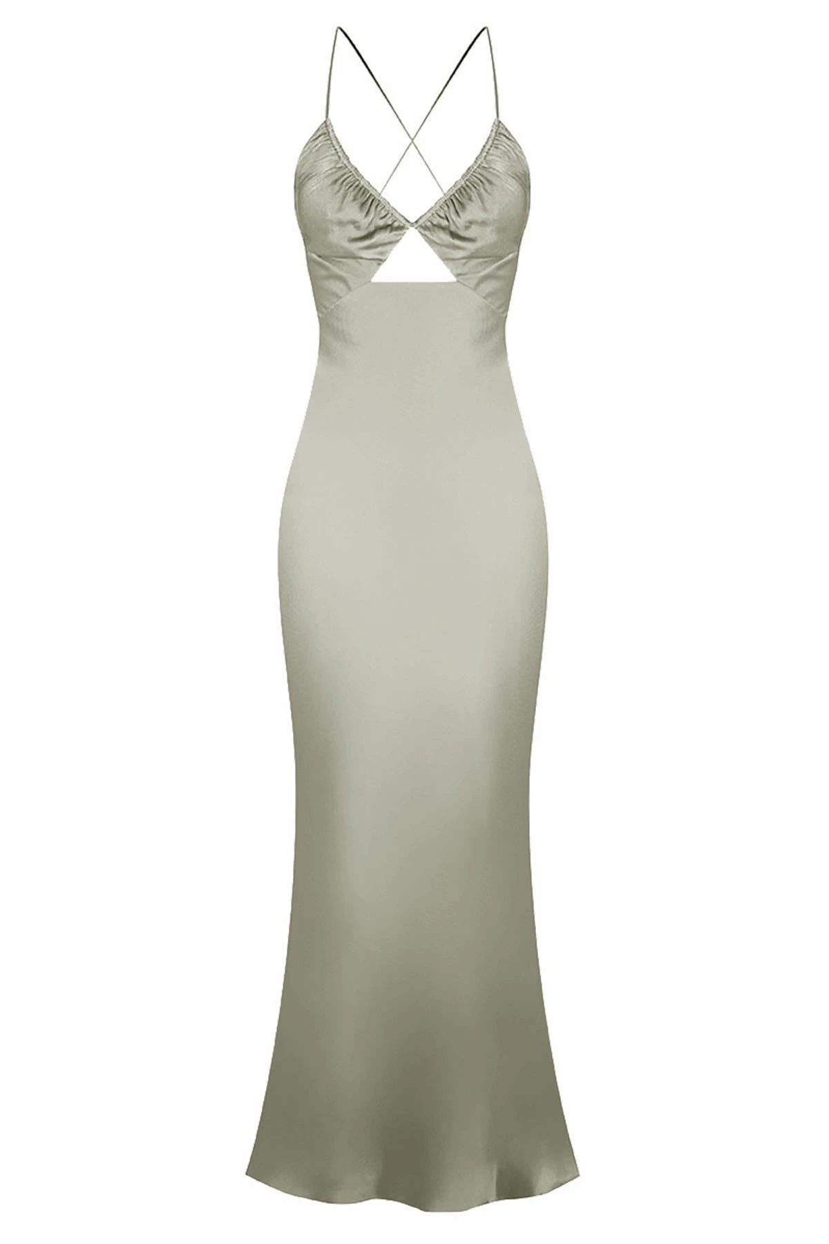 Open back midi dress with a ruched bodice in a silk touch fabric with a luxurious sheen.