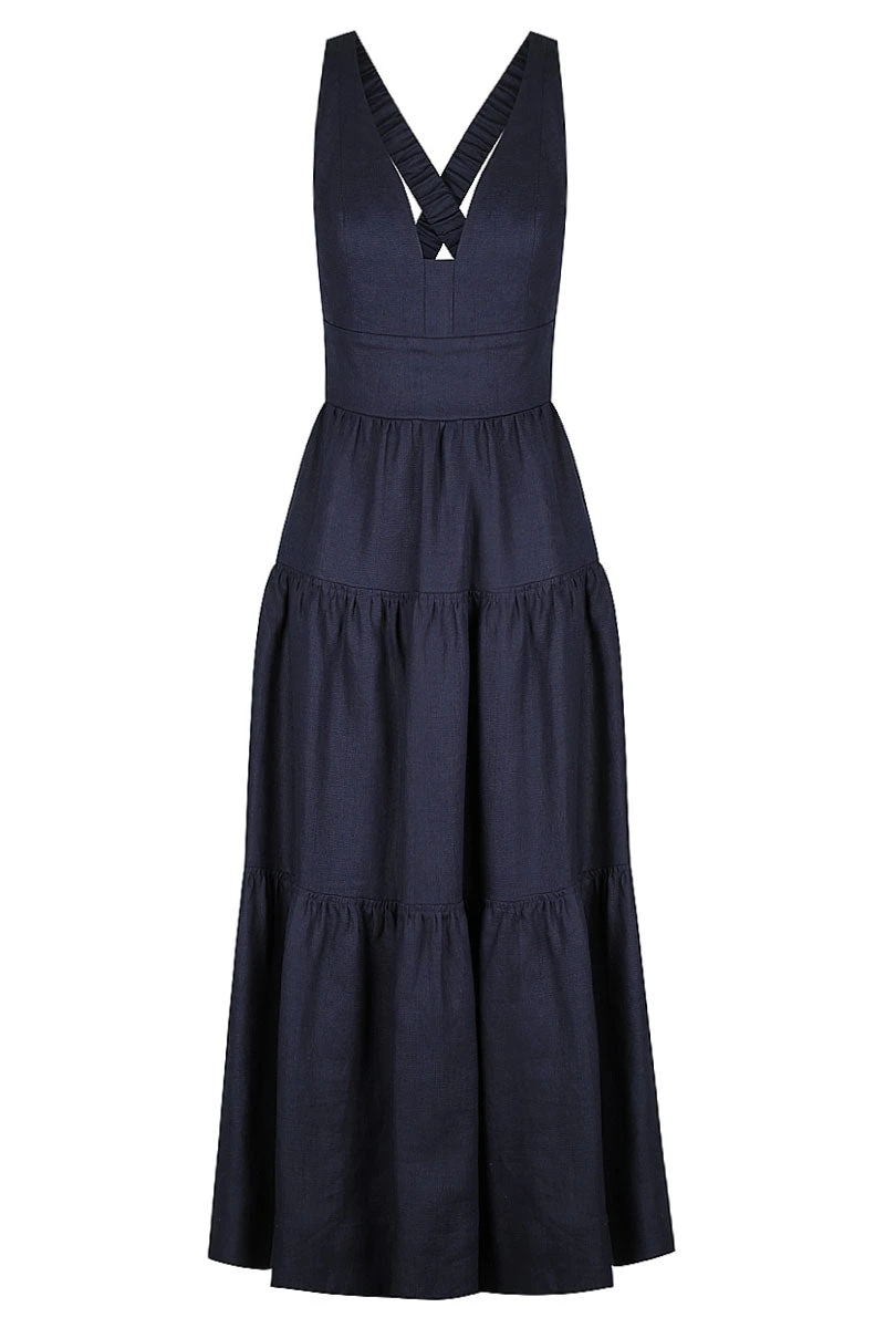 Shona Joy LIGIA LINEN PLUNGED CROSS BACK MIDI DRESS – NAVY DRESSES