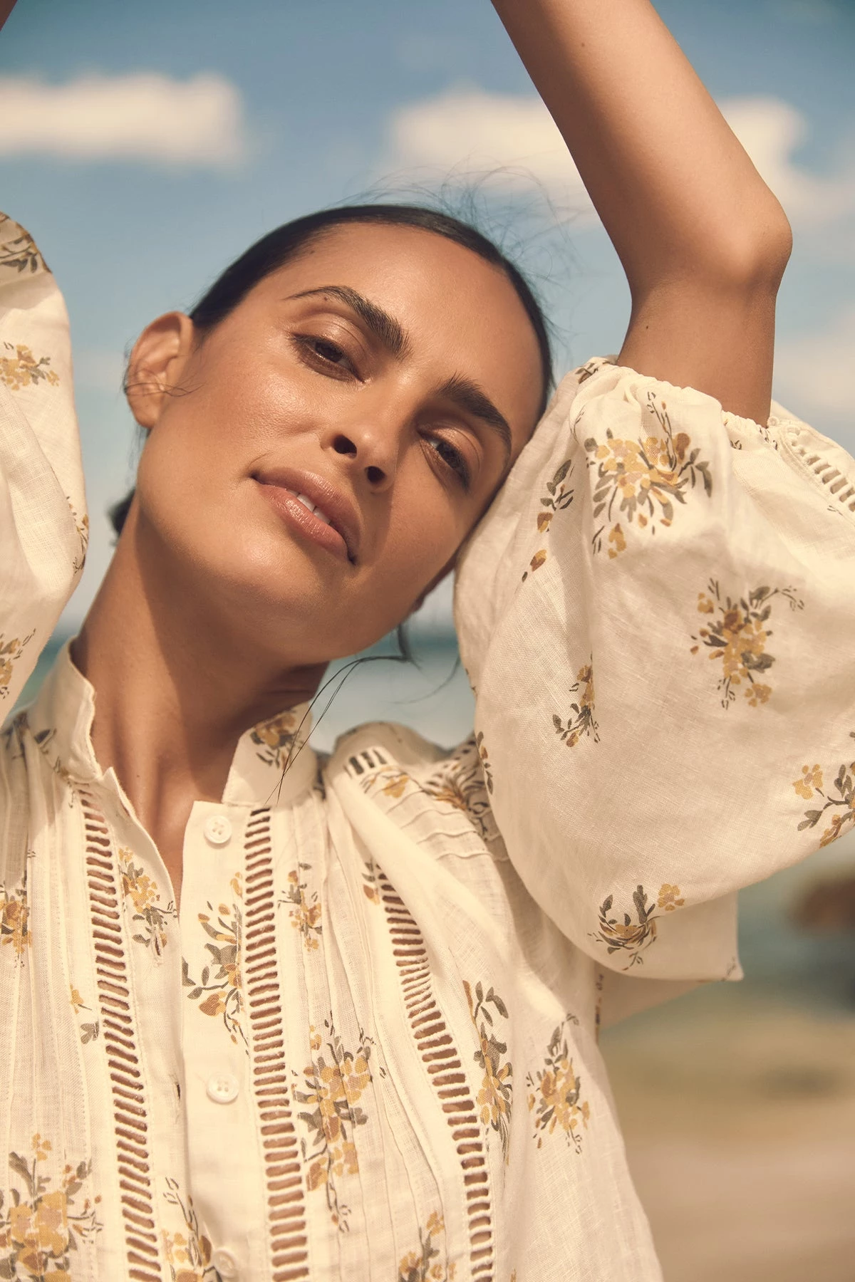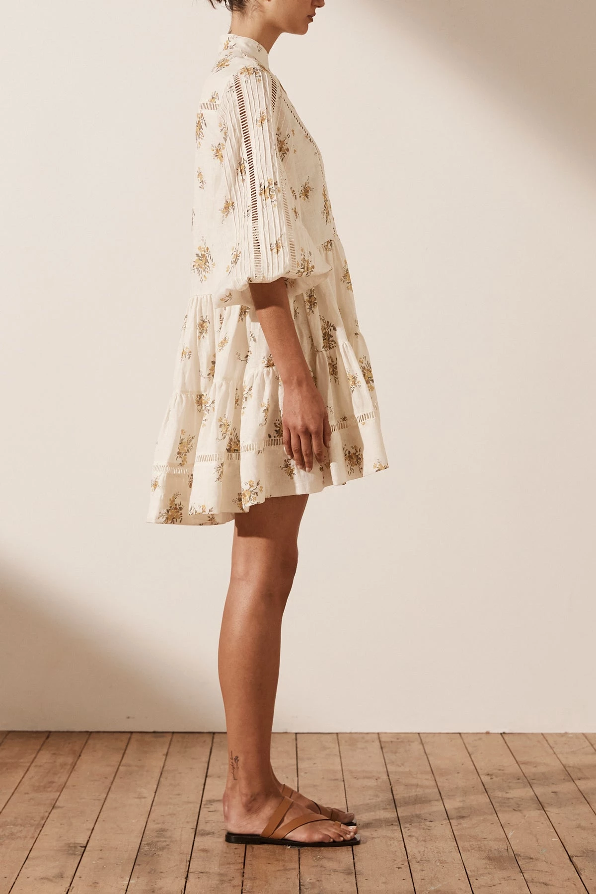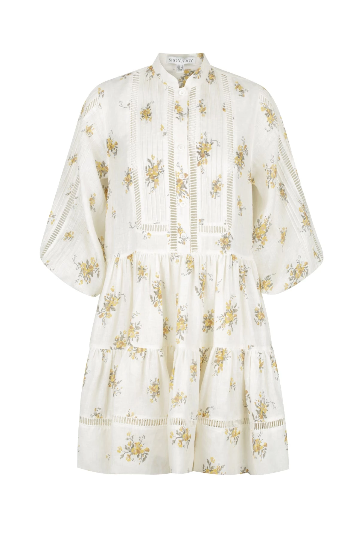 Linen tuxedo mini dress with ladder trim and pin tuck detailing in the exclusive Lila print.