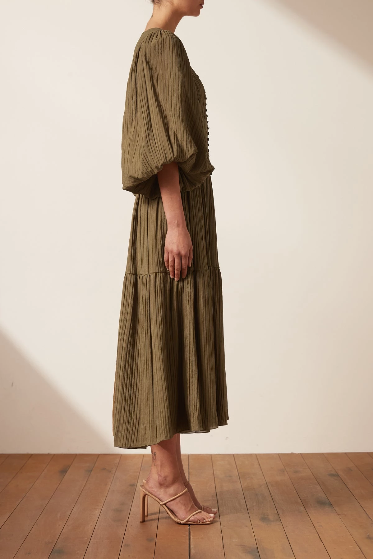 Balloon sleeve midi dress in a self stripe crinkle fabric.