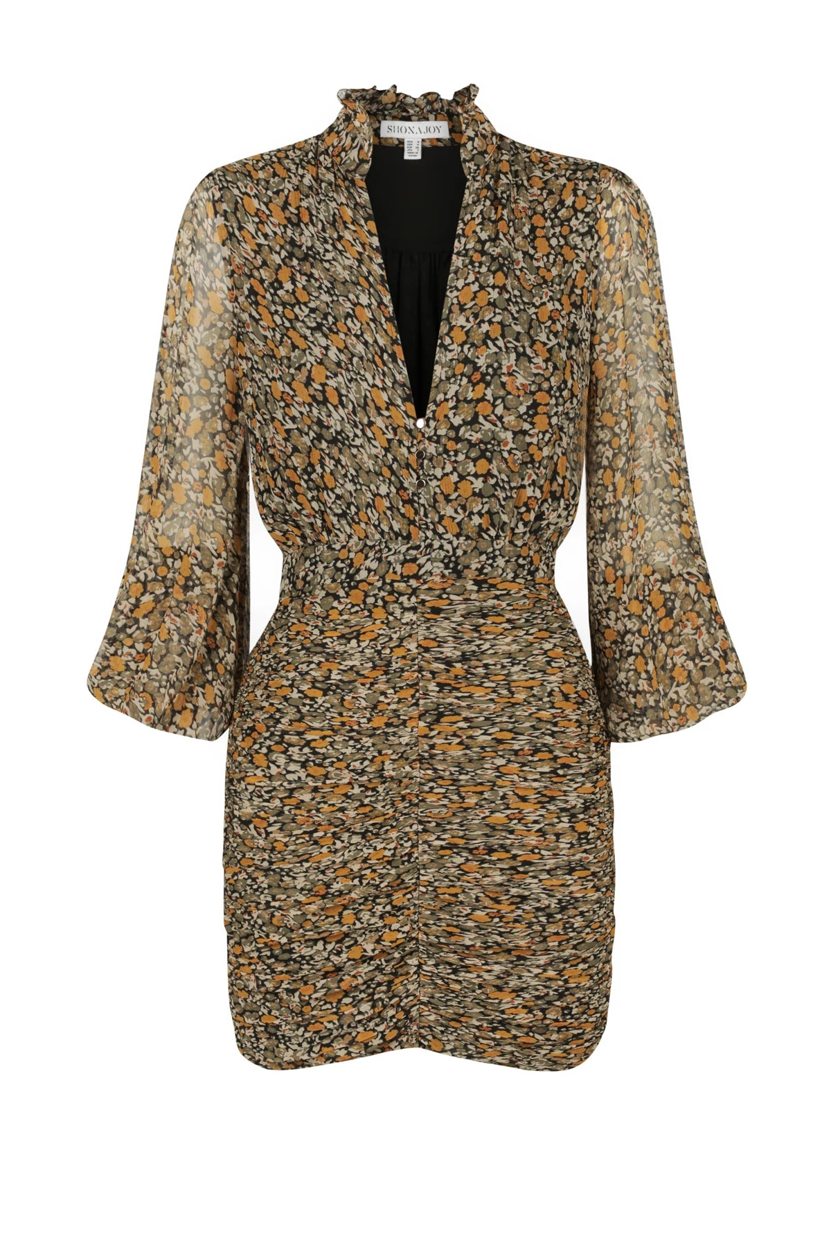 Plunged ruched mini dress in a light weight semi-sheer chiffon in the exclusive Paloma print.