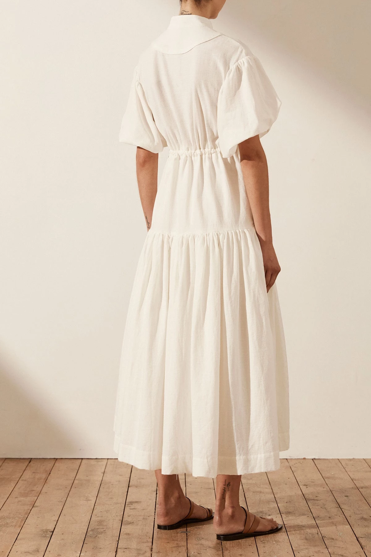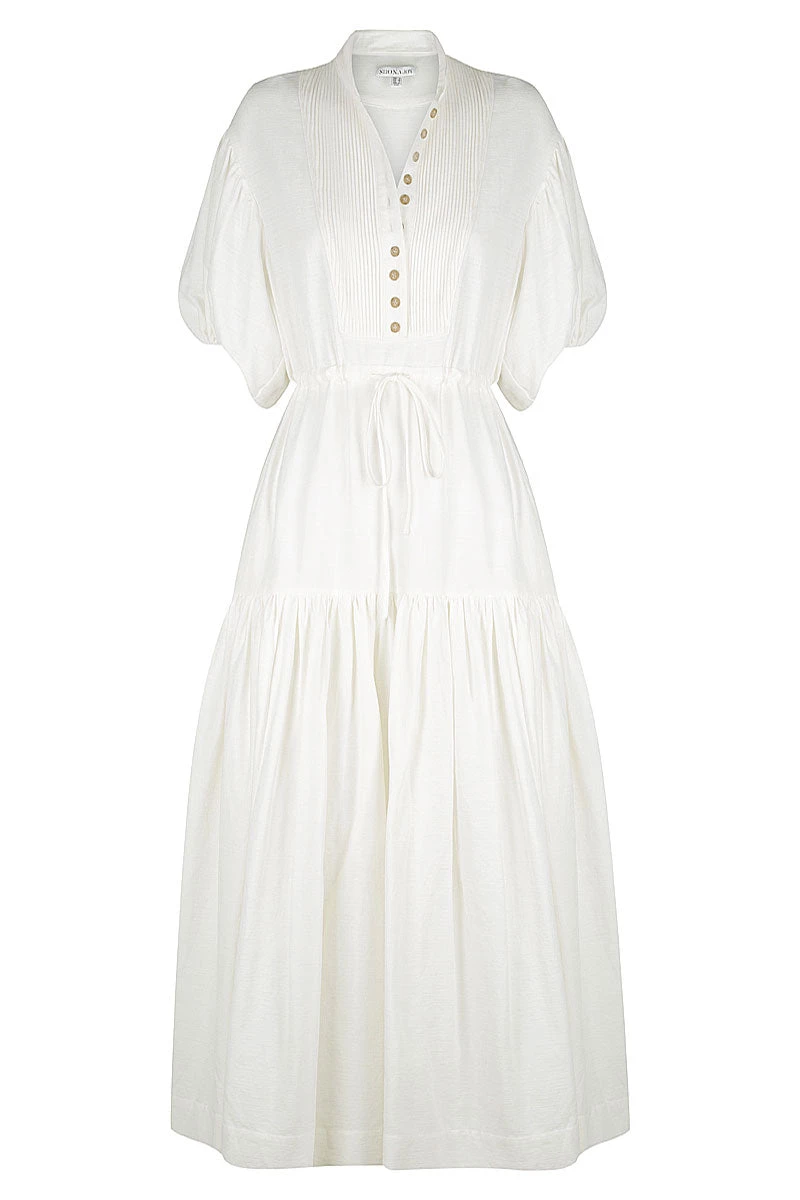 Balloon sleeve midi dress with pin tuck detail in a premium cotton-linen blend.
