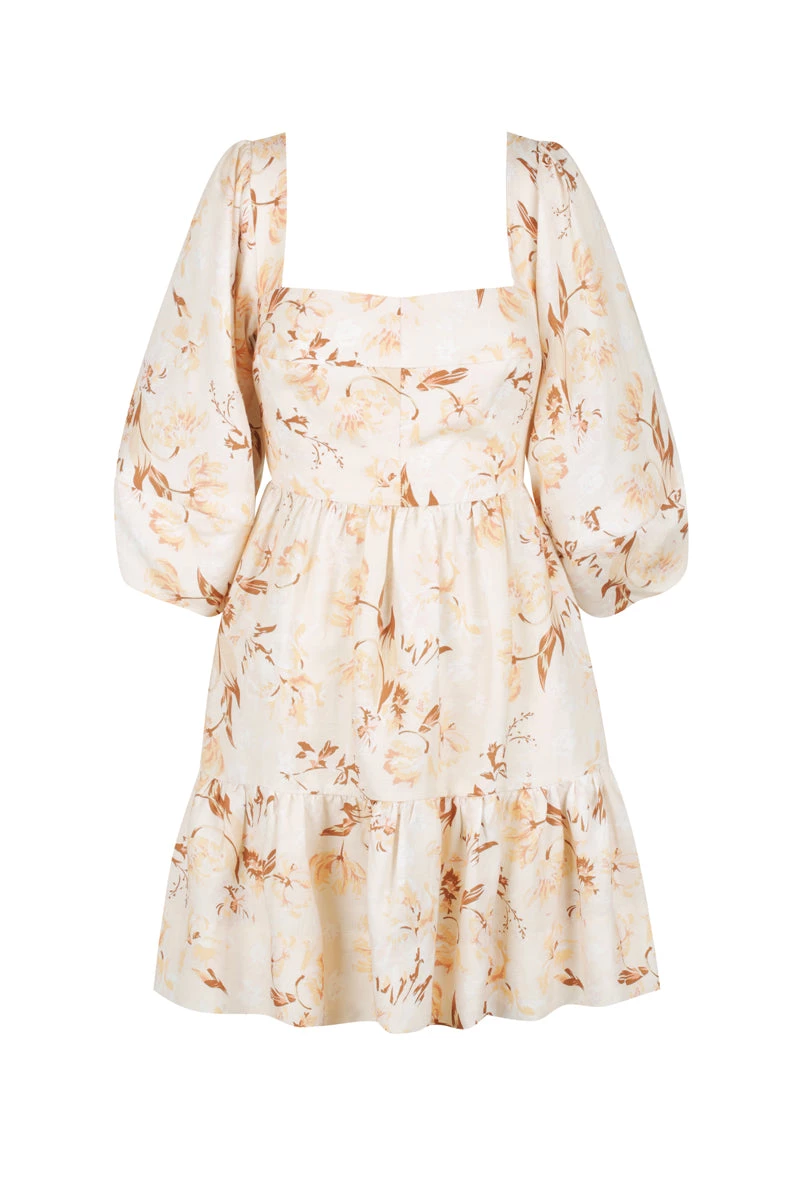 Lace back linen mini dress in the exclusive Roxanne print.