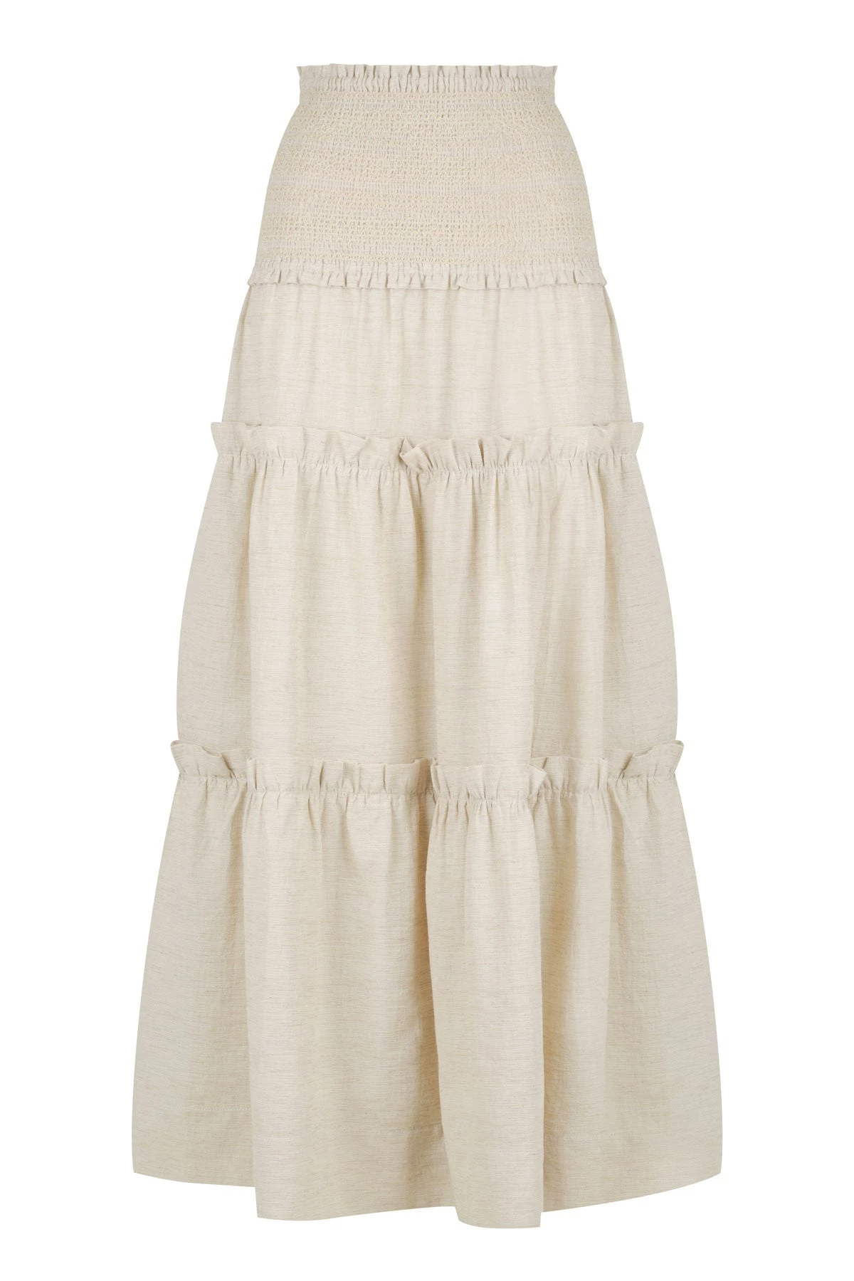 Shirred tiered midi skirt in a natural linen blend fabric.