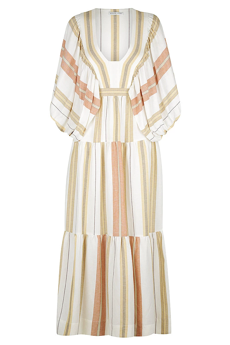 Plunged balloon sleeve midi dress in the exclusive Suzana stripe.