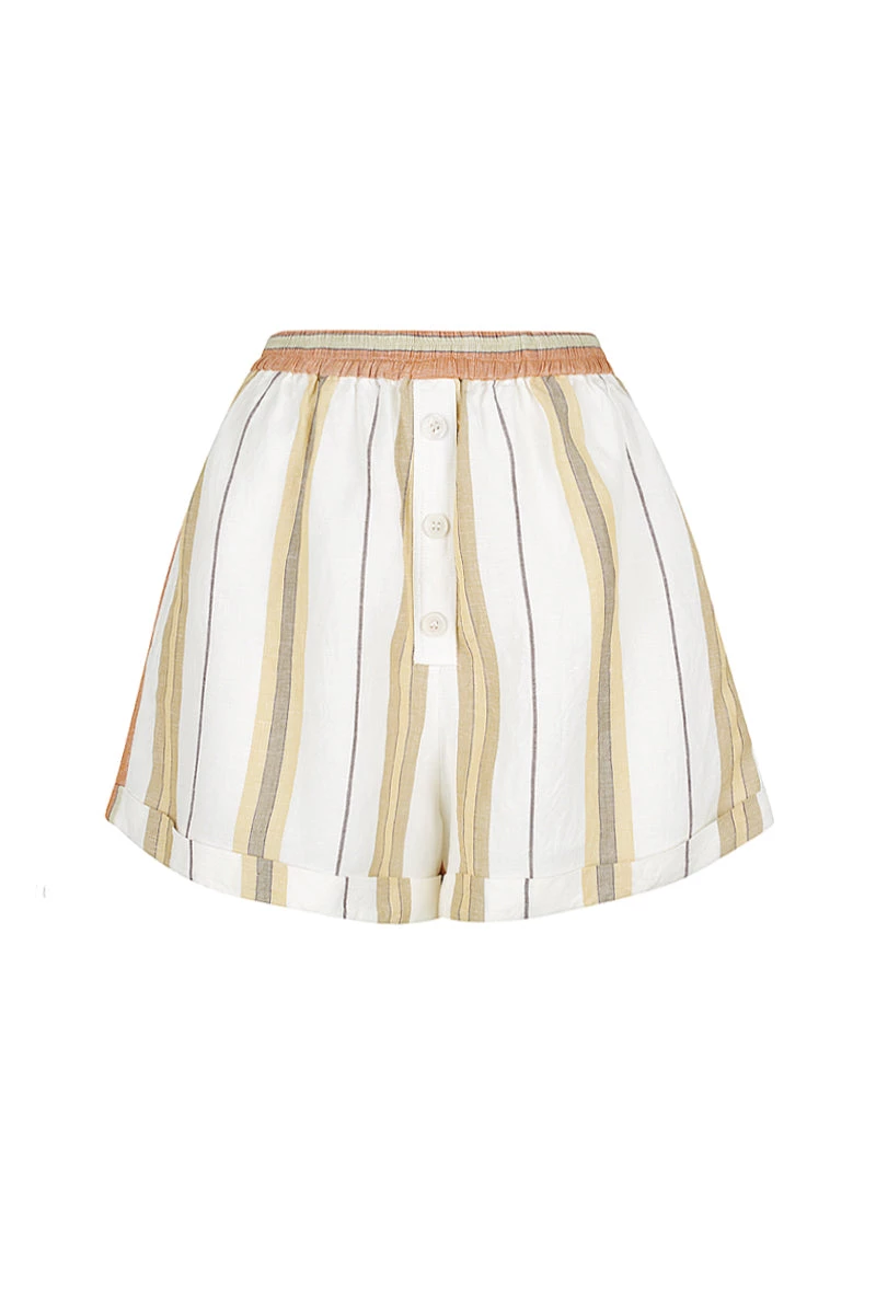 SKU: Autumn 22 6688547569798 Categories: SETS, SHORTS & PANTS Tags: Full Price, Include, Print_type: stripe, Shorts, Sibling|flor-linen-short-apricot-multi
