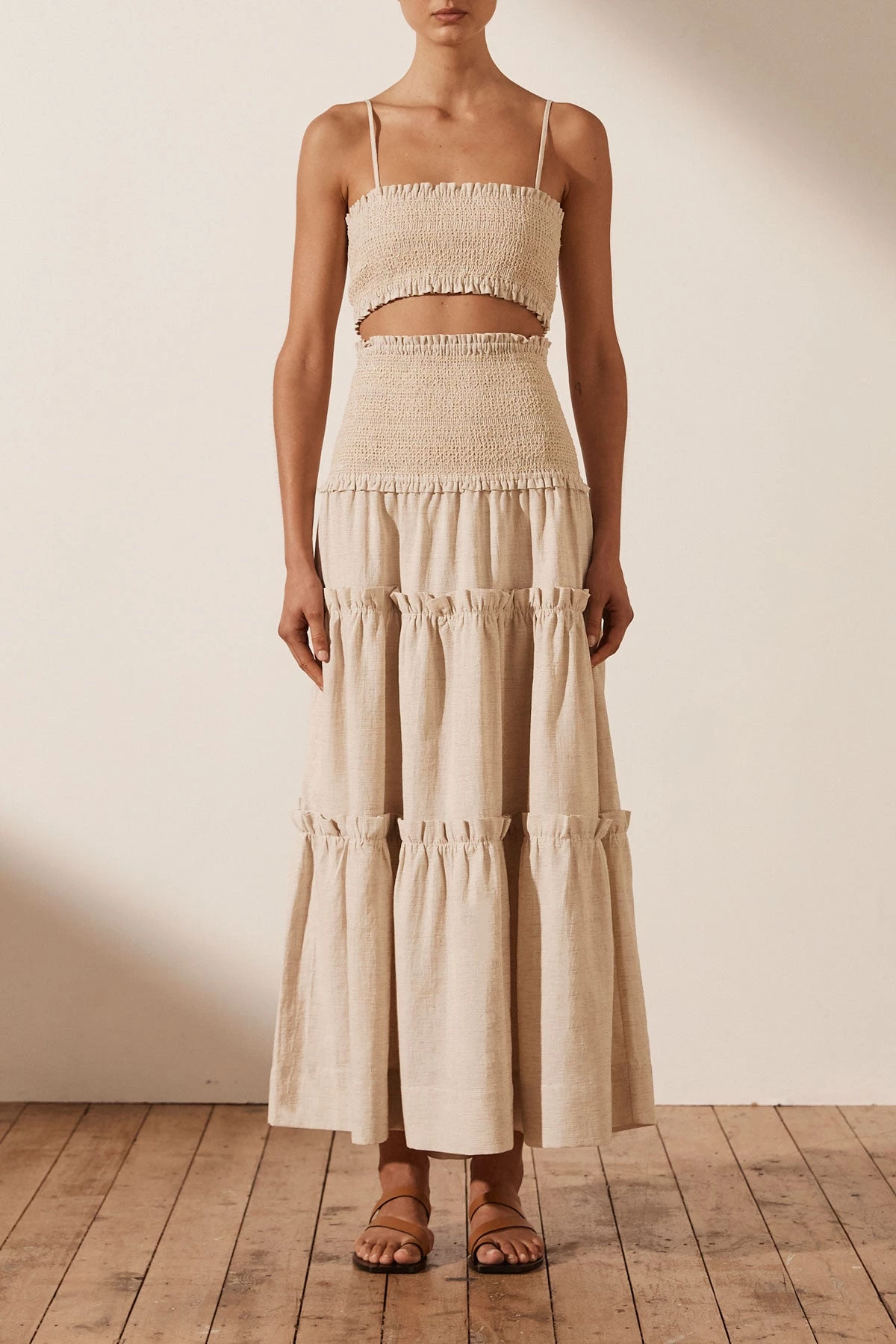 SKU: Summer 21 6616812814470 Categories: SETS, TOPS Tags: Colour_tone: neutral, Fabric: textured stripe cotton, Length: cropped, Main Section, Sibling|fiona-shirred-bralette-oatmeal