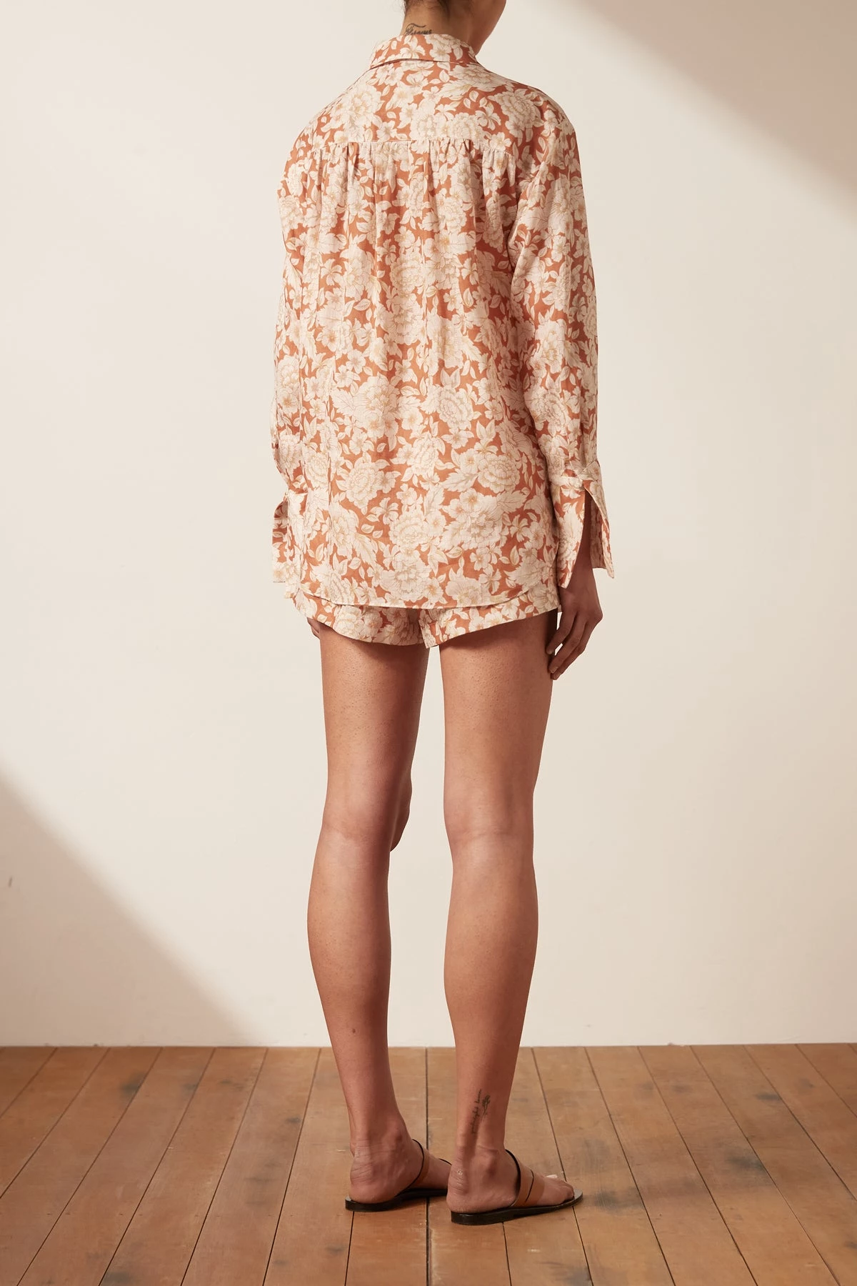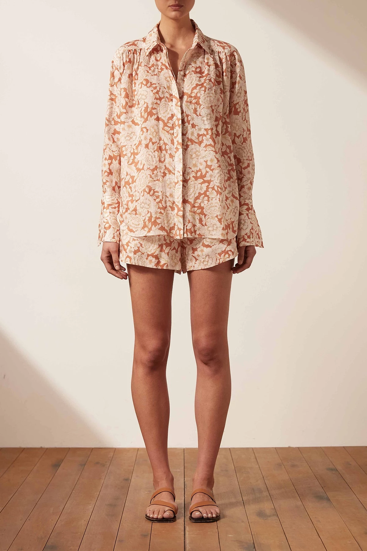Balloon sleeve linen shirt with exaggerated cuffs in the exclusive Flor print.