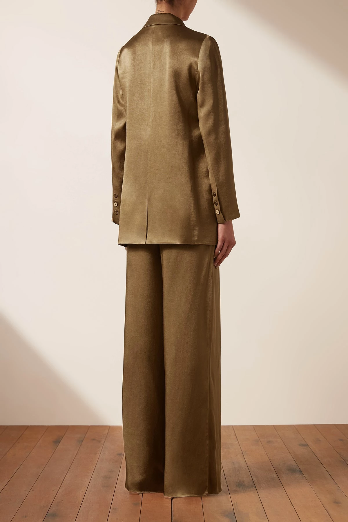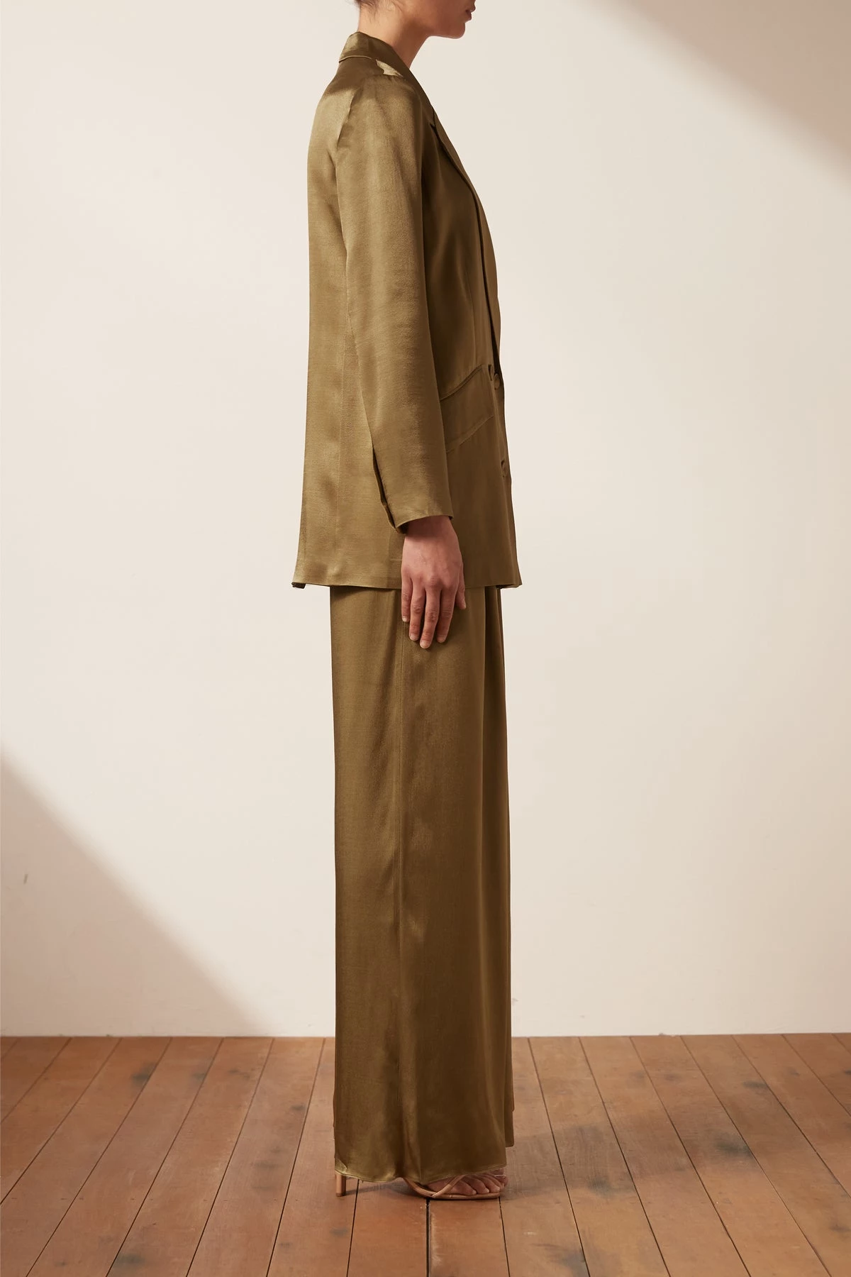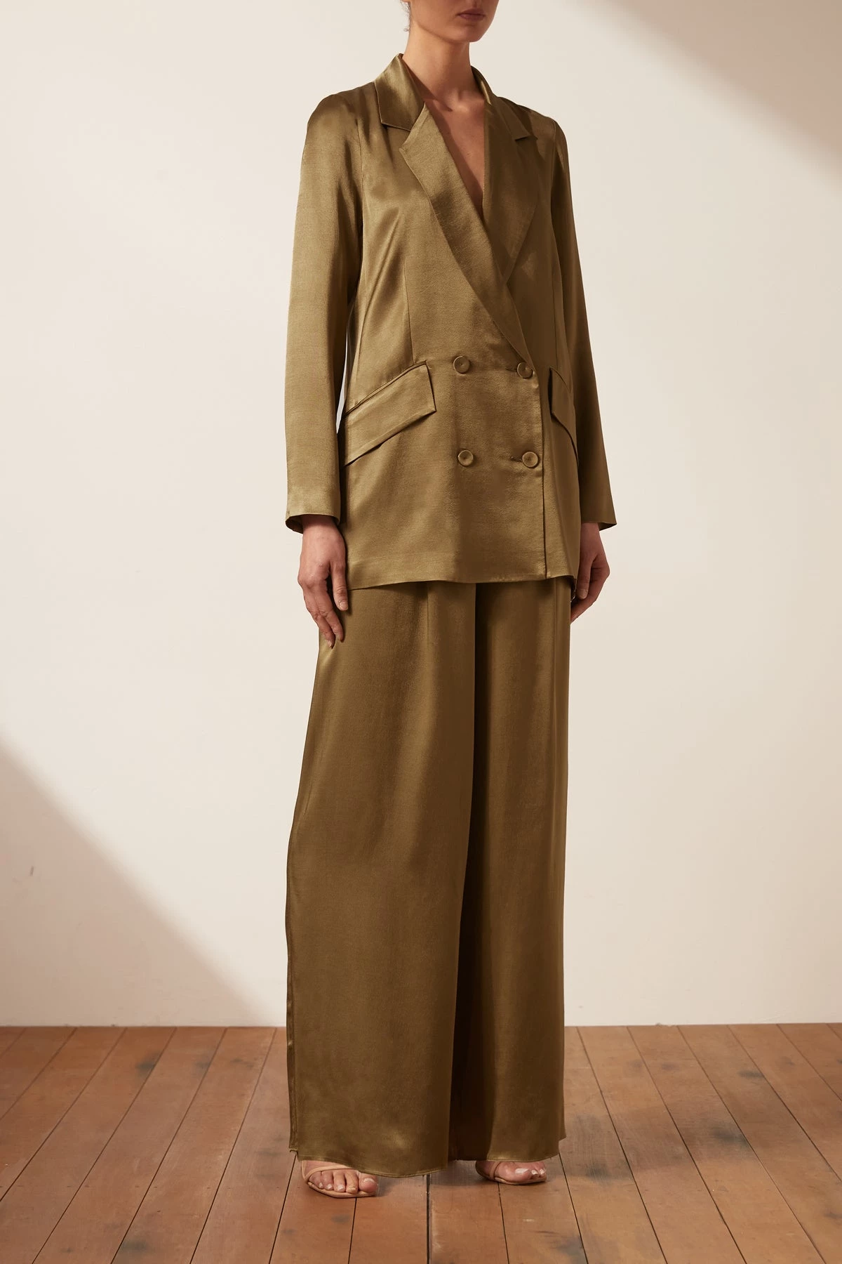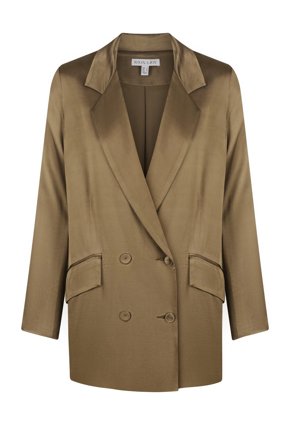 Double breasted blazer in a silk touch fabric with a luxurious sheen.