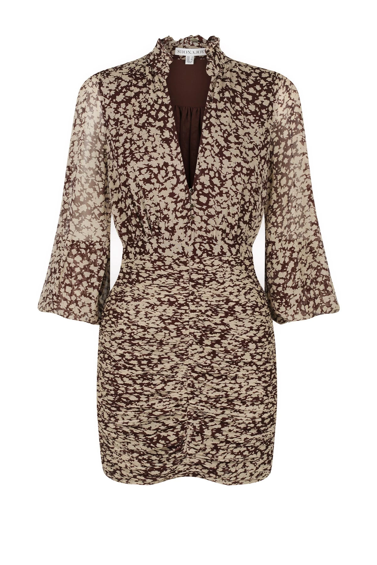 Plunged ruched mini dress in a light weight semi-sheer chiffon in the exclusive Valeria print.