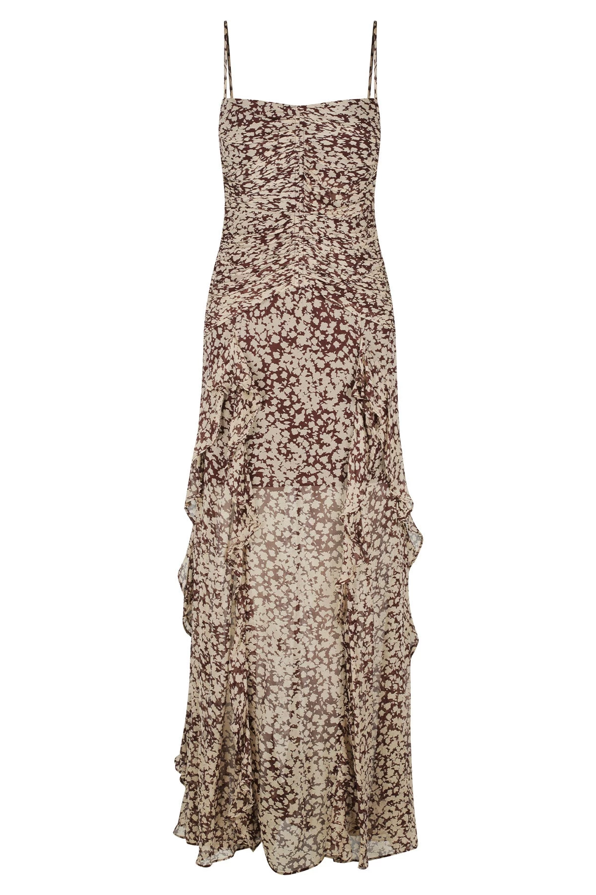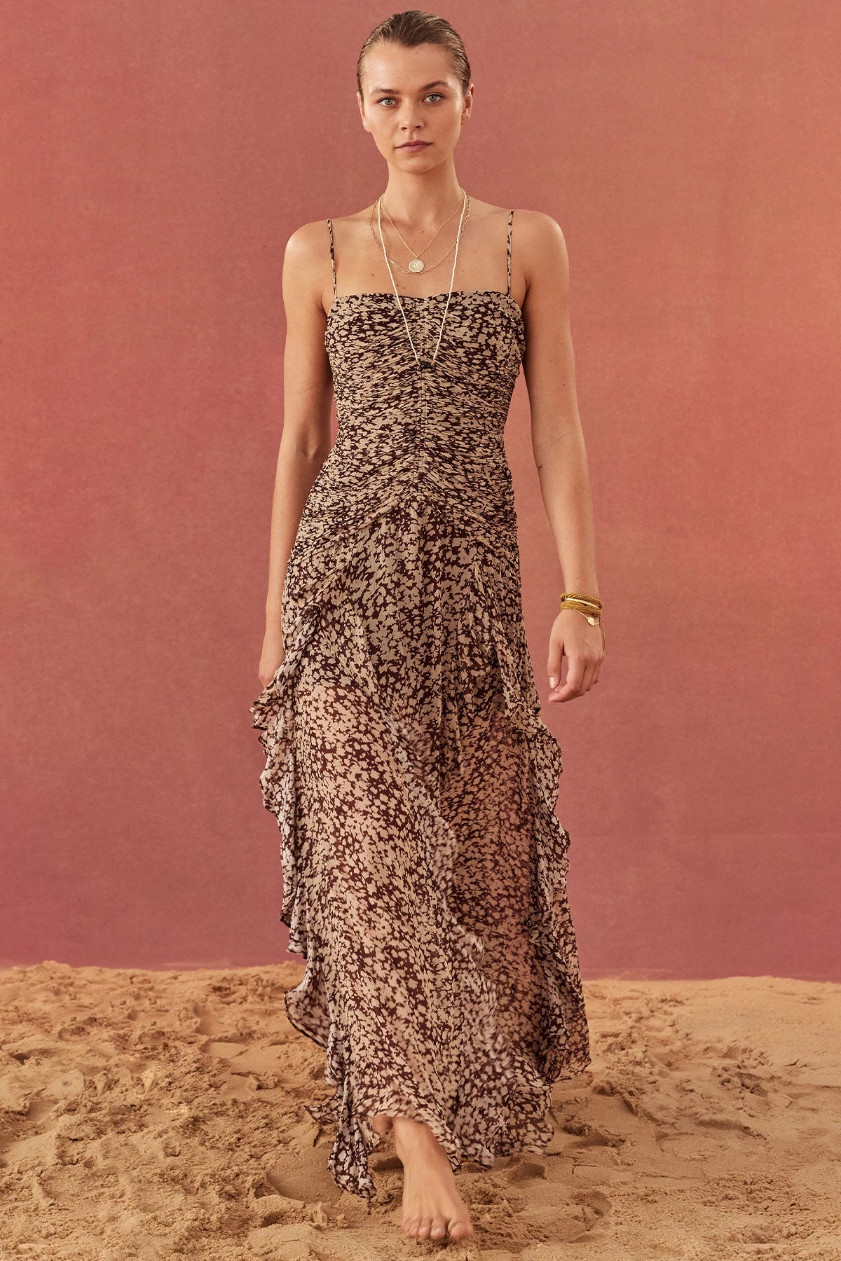 Strappy frill maxi dress in a light weight semi-sheer chiffon in the exclusive Valeria print.